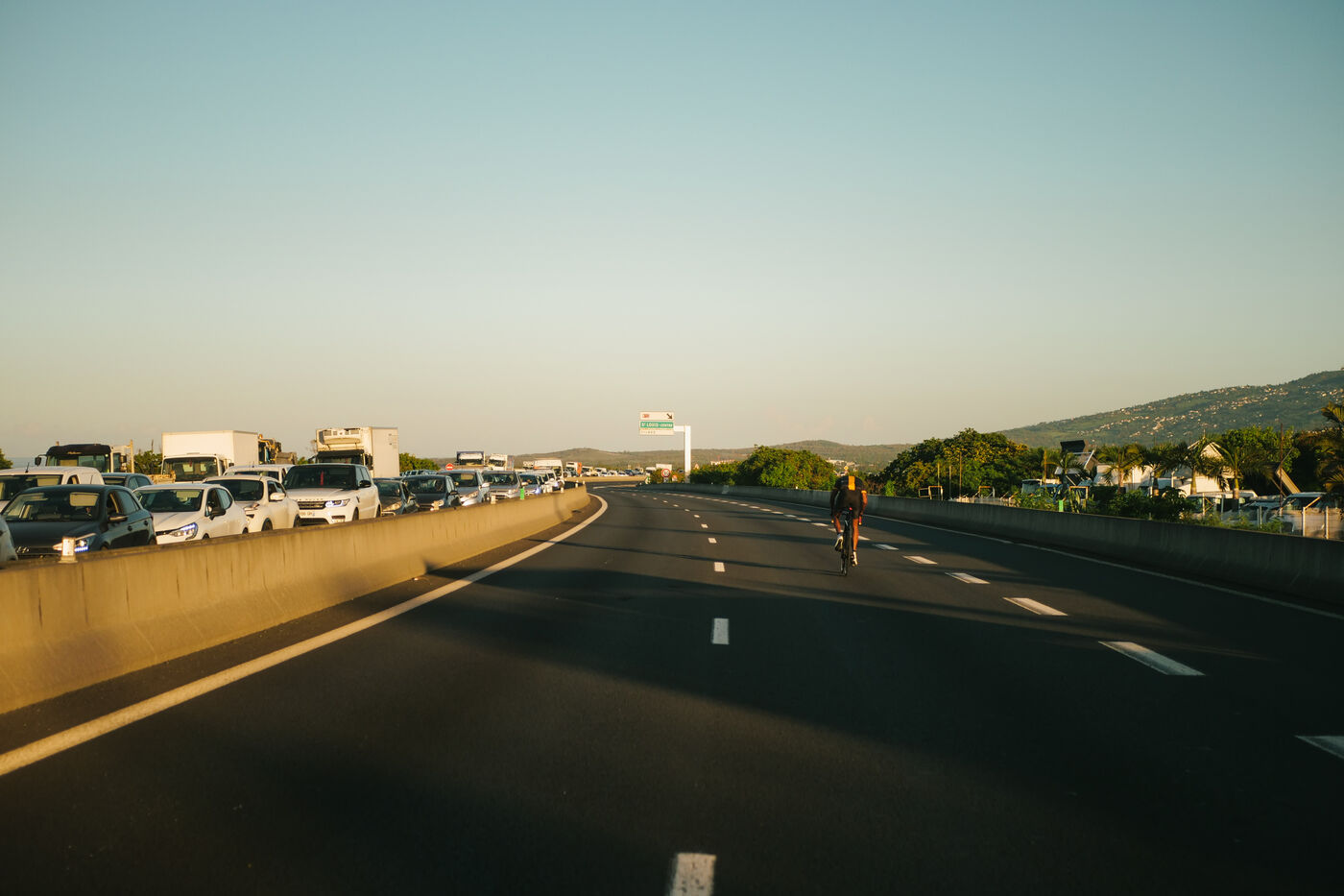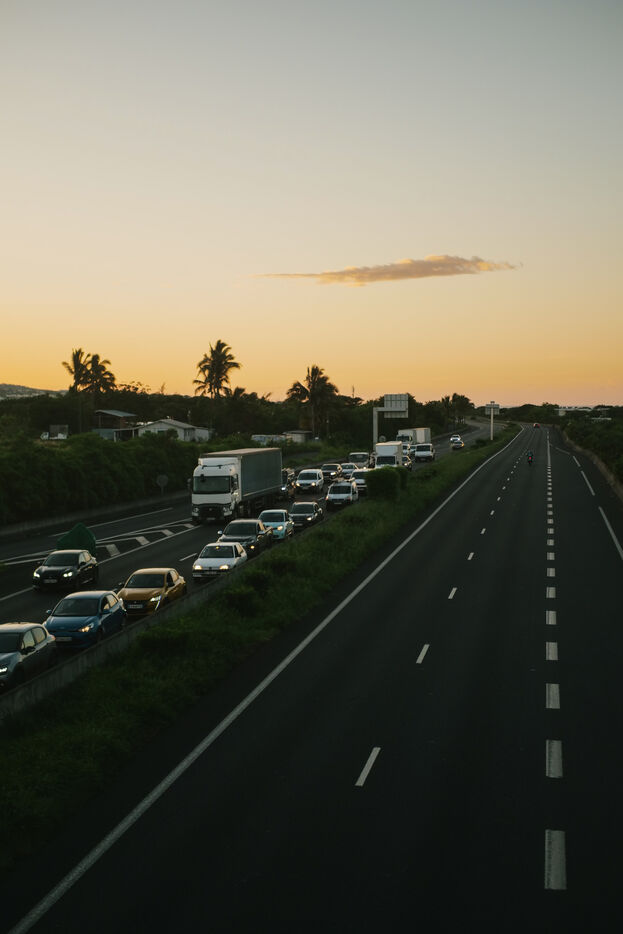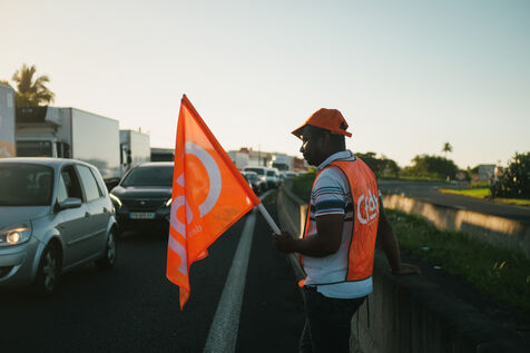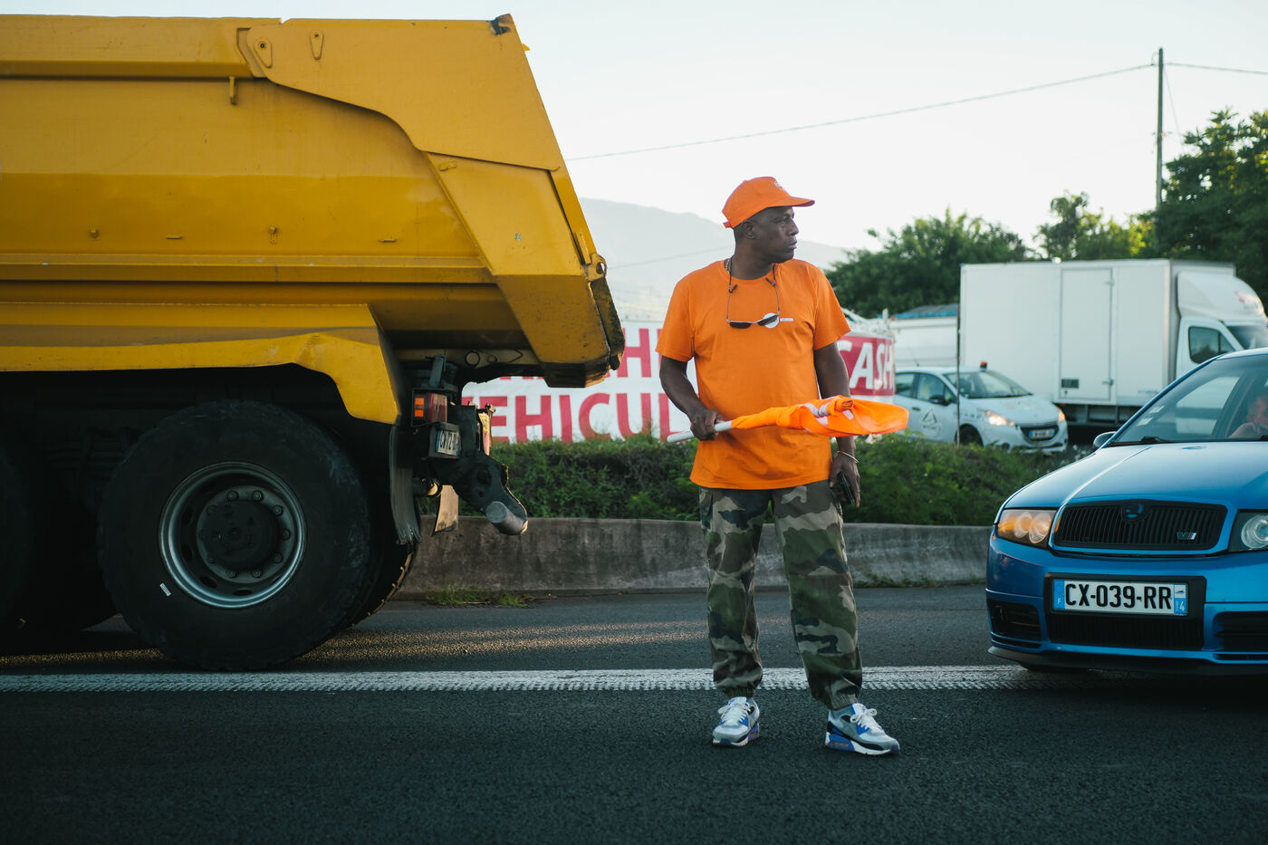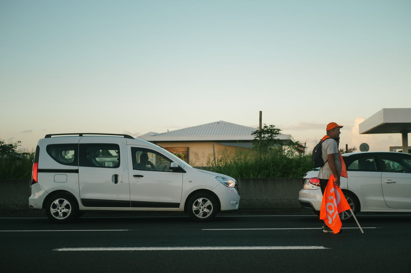 New road blockade in Saint Pierre, in the south of Reunion Island, during the 9th day of national mobilization to protest against the pension reform. This reform was definitively adopted in Parliament on March 20, 2023, after the Borne government used the 49.3 article. Emmanuel Macron spoke publicly on March 22, the day before this 9th day of mobilization. Here, in Pierrefonds (Saint Pierre), several members of the CFDT decided to block the main road axis, from dawn. Traffic jams were formed very quickly but motorists showed understanding. No tension was observed.