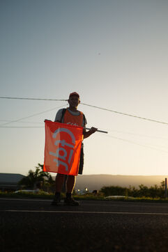 Nouveau blocage routier à Saint Pierre, dans le sud de La Réunion, lors de la 9eme journée de mobilisation nationale pour protester contre la réforme des retraites. Celle-ci a été définitivement adoptée au Parlement le 20 mars 2023, après le recours du gouvernement Borne à l'article 49.3. Emmanuel Macron a pris la parole publiquement le 22 mars, soit la veille de cette 9eme journée de mobilisation. Ici, à Pierrefonds (Saint Pierre), plusieurs membres de la CFDT ont décidé de bloquer l'axe routier principal, dès l'aube. Des embouteillages se sont formés très rapidement mais les automobilistes ont montré de la compréhension. Aucune tension observée.