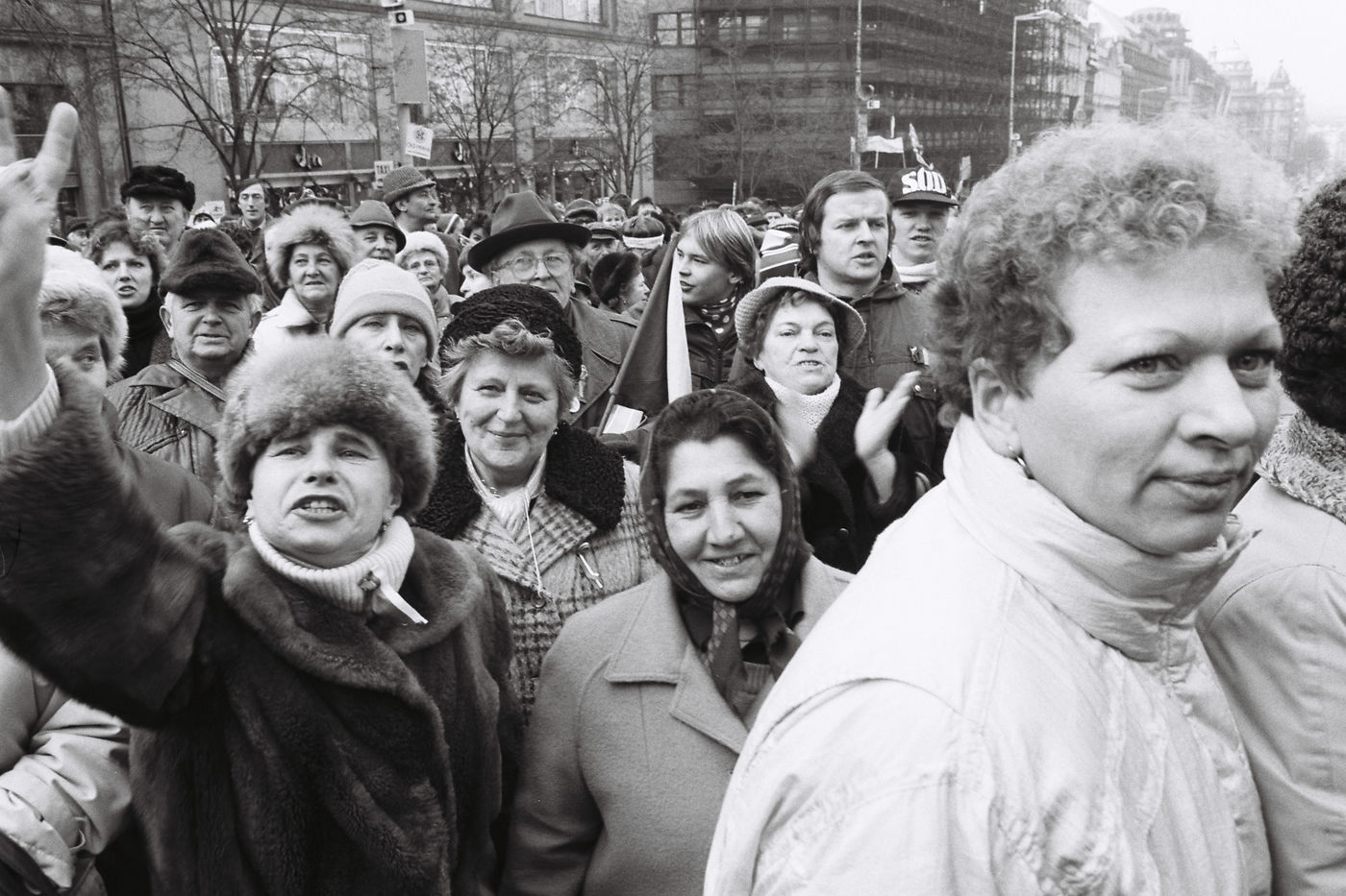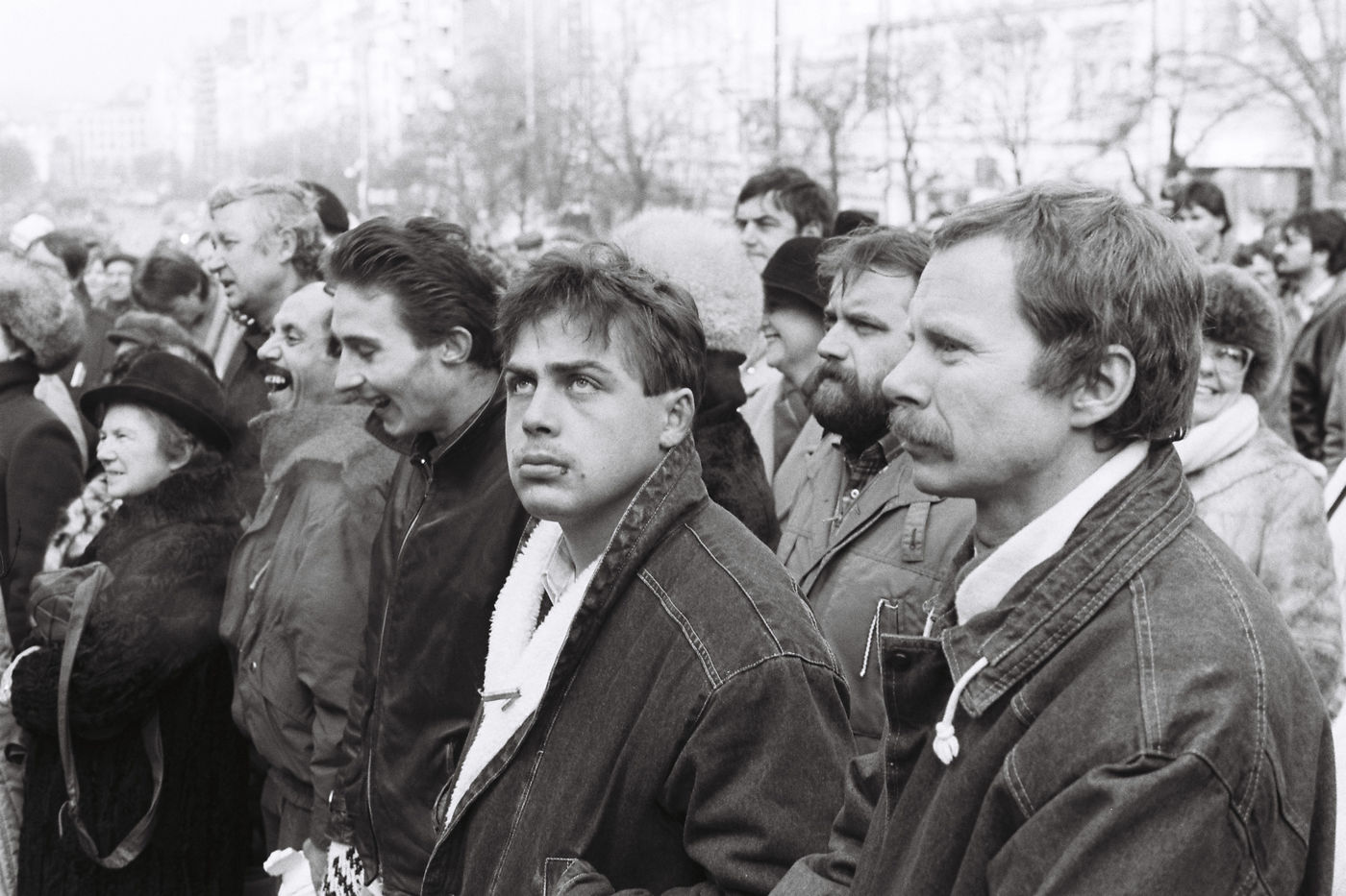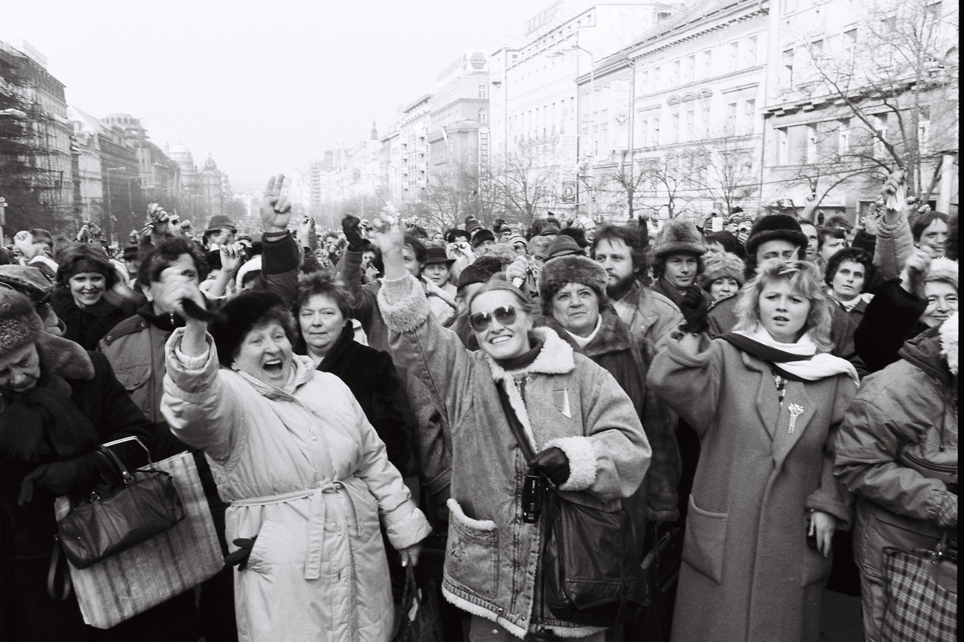 La démission du Président communiste provoque une immense manifestation spontanée : Des milliers de gens sortent dans les rues de Prague joyeux, incrédules, soucieux.