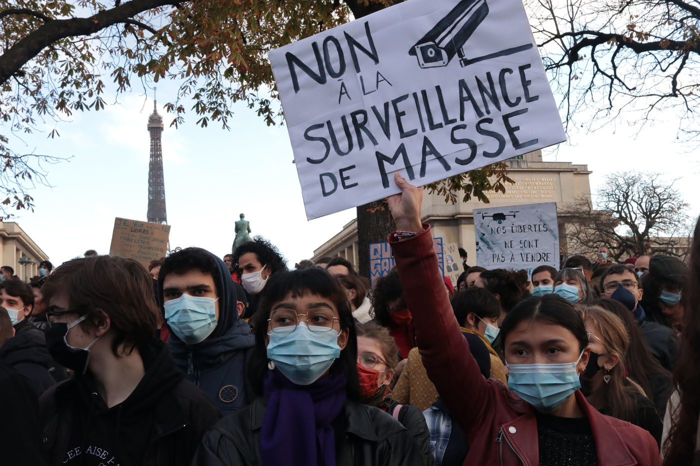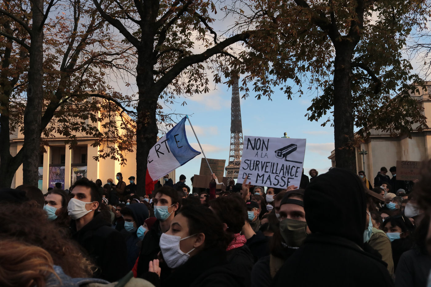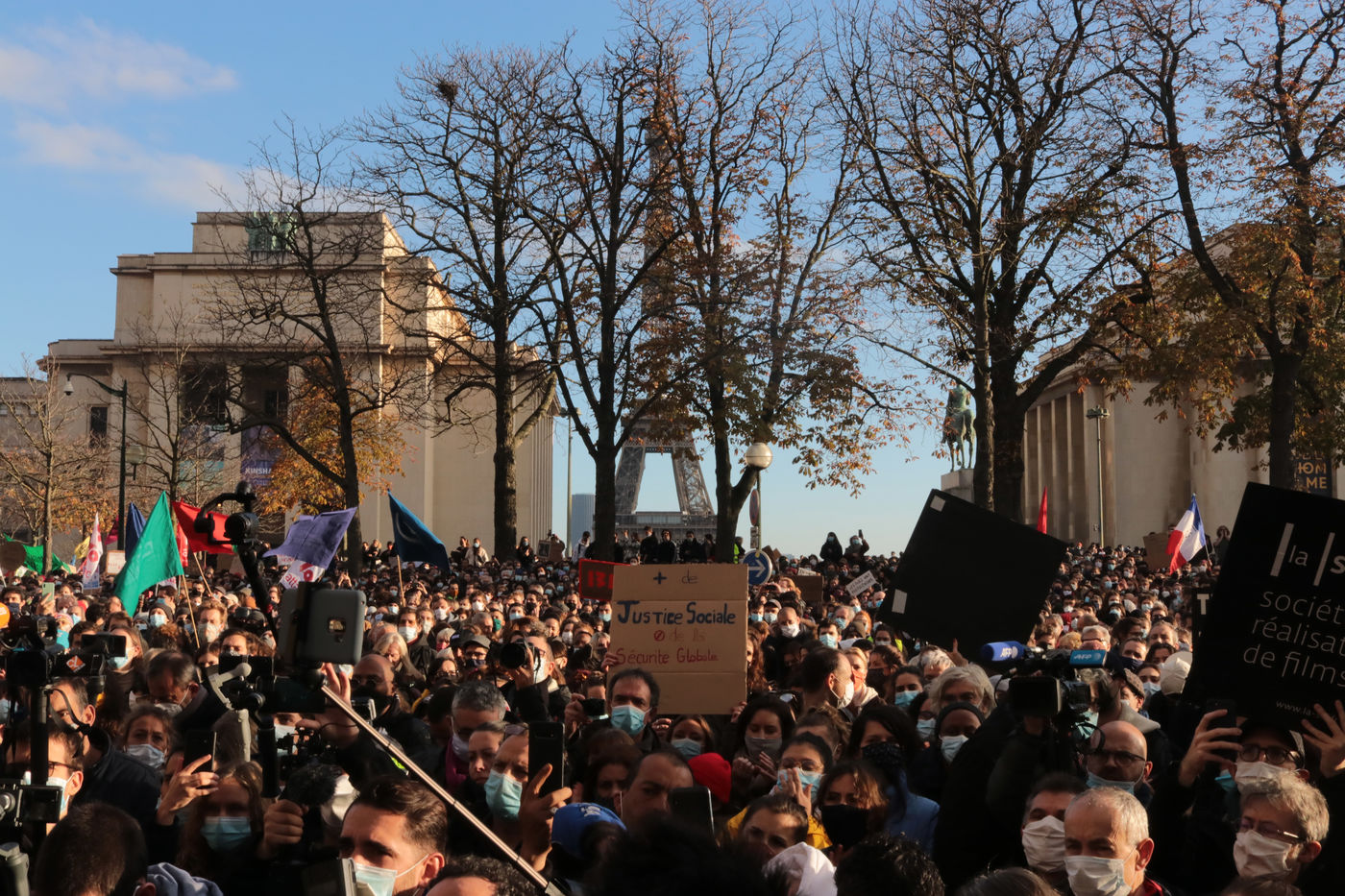 In Paris, a demonstration at Place Trocadero called by Journalists Unions, The Human Rights League and Amnesty France united several thousands of people, on Novembre 21, against a Law proposition called «Global Security». Article 24 of this proposition voted by the Parliament Friday night November 20, inquires for « a year imprisonnement and a 45 000€ fine» for diffusing clear images of Policemen of Military personnel « with a motive to undermine their physical or psychological integrity ».