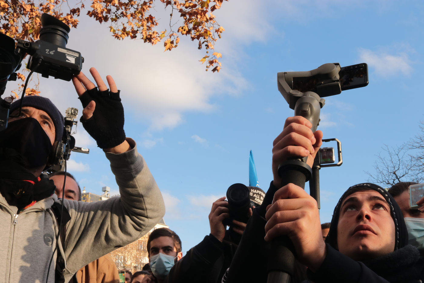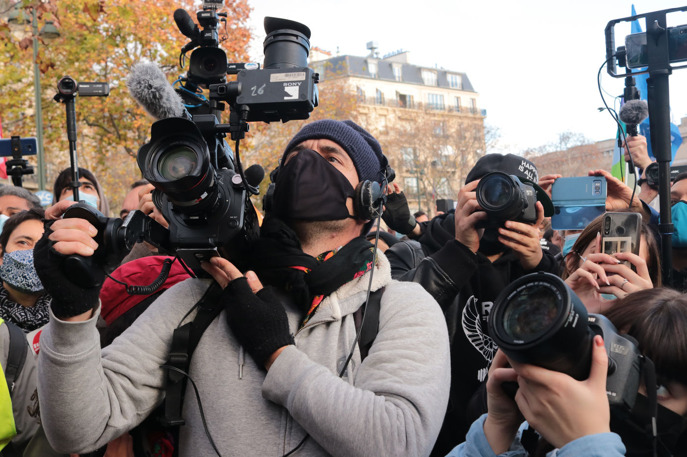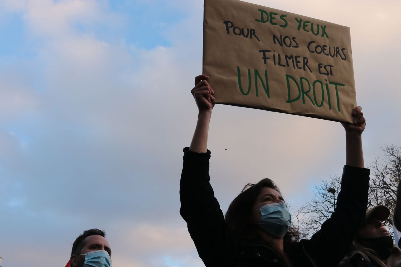 In Paris, a demonstration at Place Trocadero called by Journalists Unions, The Human Rights League and Amnesty France united several thousands of people, on Novembre 21, against a Law proposition called «Global Security». Article 24 of this proposition voted by the Parliament Friday night November 20, inquires for « a year imprisonnement and a 45 000€ fine» for diffusing clear images of Policemen of Military personnel « with a motive to undermine their physical or psychological integrity ».