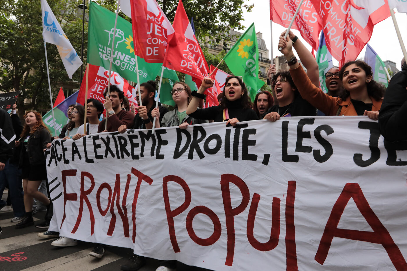 Des dizaines de milliers de personnes ont manifesté à Paris à l appel du Nouveau Front Populaire et des syndicats contre la montée de l Extrême Droite aux récentes élections européennes et le Rassemblement National de Marine Le Pen et avant les élections législatives anticipées en France.