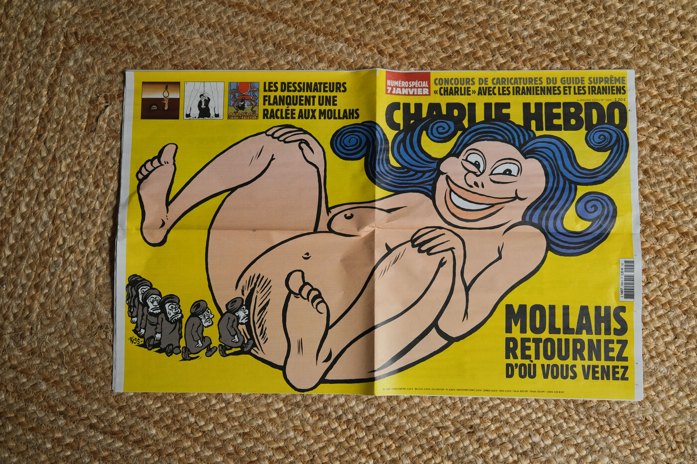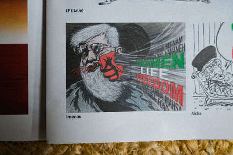 France, Toulouse, 2023-01-05. The satirical newspaper Charlie Hebdo, in support of the Iranian people s uprising, published caricatures of the mullahs in its 4 January edition. Responding to the newspaper s call, cartoonists from all over the world sent several hundred drawings to the editorial office, featuring Supreme Leader Ali Khamenei in particular; the editorial office had itself been the target of the Islamist attacks of 7 January 2015. The Iranian regime protested against these publications and closed the French Research Institute, the oldest French study centre in Iran.