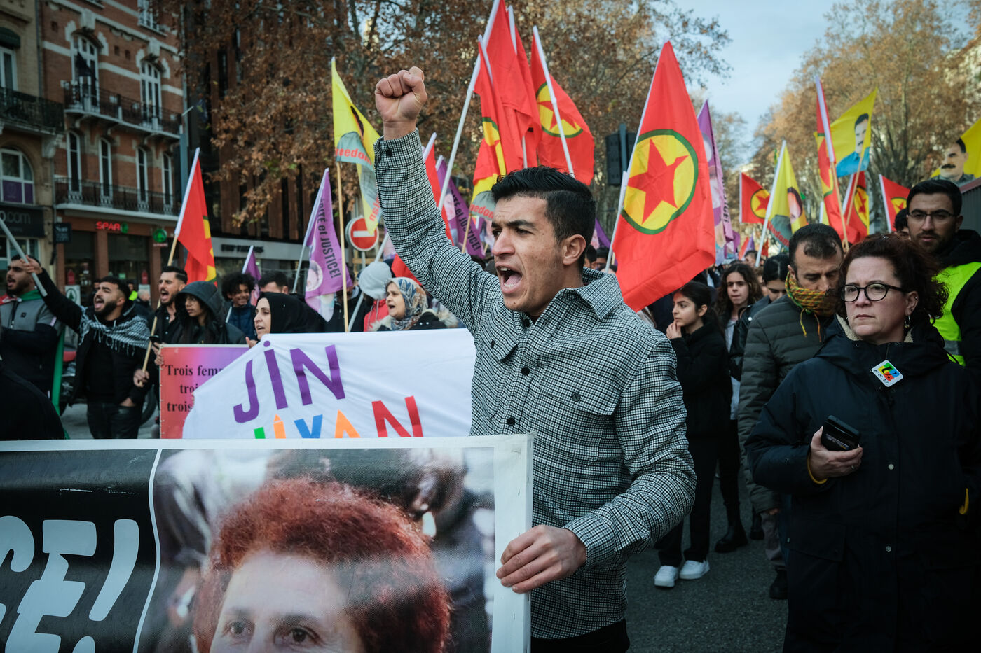 France, Toulouse, 2023-01-07. Dix ans apres les attentats turcs du 9 janvier contre des kurdes a Paris, et quelques semaines apres un attentat raciste egalement perpetre a Paris, la communaute Kurde a manifeste dans les rues de Toulouse.