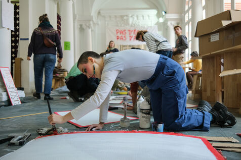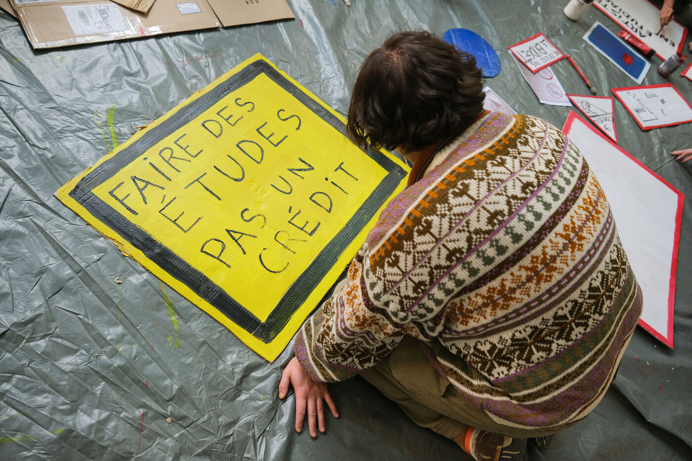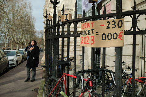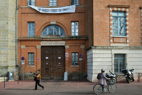 Toulouse, France, 2023-02-01. The students and staff of ISDAT (formerly Beaux-Arts) organised a morning of mobilisation before their board meeting. They are protesting against insufficient resources, even though the institution includes graphic arts, design, music and dance. The 2022 budget would be lower than the 2012 one. They welcomed the board members with a hurdle of dishonour.