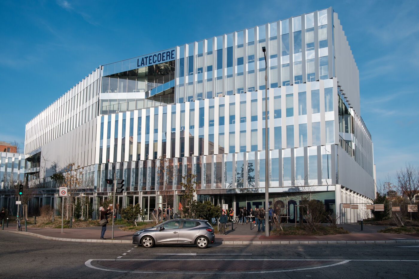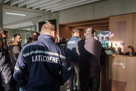 Toulouse, France, 2023-02-15. Rassemblement de salariés devant le siège social du Groupe Latécoère, et rencontre avec la Direction. L'activité du site de Toulouse - Monredon, inauguré en 2018 et regroupant plus d'une centaine de salariés, devrait être délocalisée au Mexique et en Tchéquie, et le site de Toulouse - Labège devrait fermer.