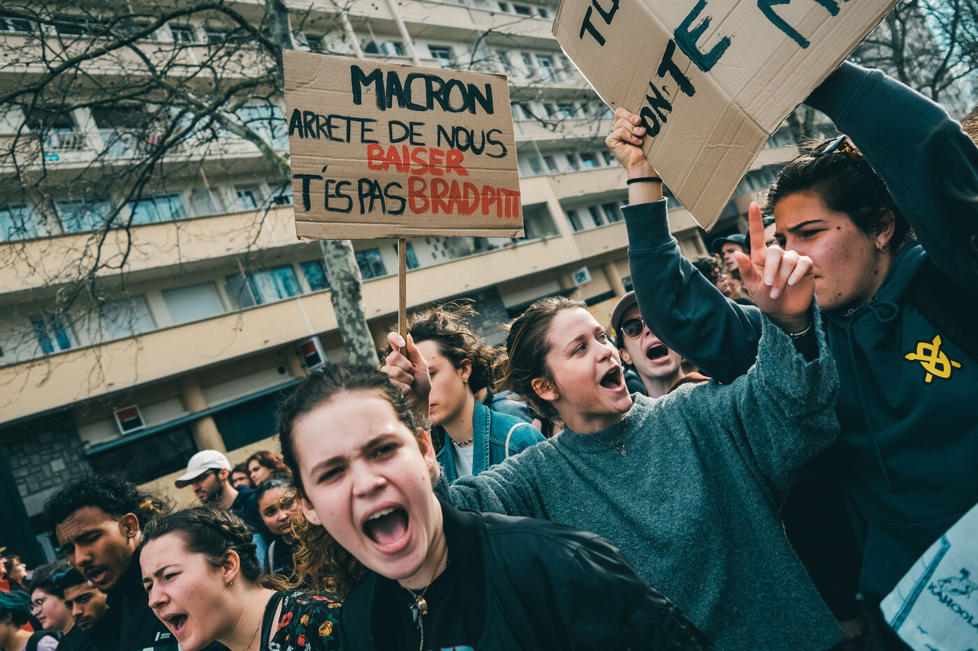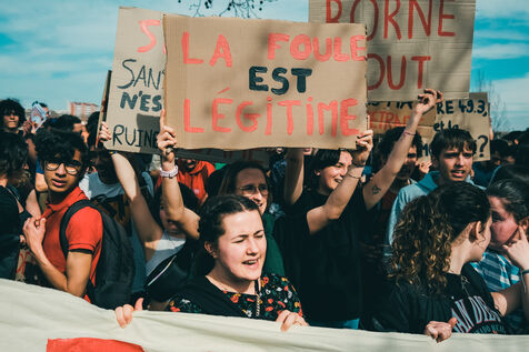 Toulouse, France, 2023-03-23. Pour la neuvième fois en deux mois, une manifestation nationale a eu lieu à Toulouse, suivant l'appel de l'intersyndicale. Une foule très nombreuse s'était donné rendez-vous dans la rue, malgré l'adoption de la réforme des retraites par l'article 49.3, et les déclaration du président la veille. La jeunesse (lycéens, étudiants) était également très présente.