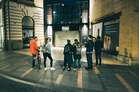 Toulouse, France, 2023-03-30. Des citoyens s'engagent pour sensibiliser les boutiques à éteindre leur enseigne dès la nuit tombée. Armés de téléphones portables, ils sillonnent la ville et repèrent les enseignes encore allumées. En se connectant sur lightsoff.fr, il peuvent prendre une photo de la boutique et la joindre à un message pré-rédigé, et ensuite poster un avis Google. Par un message de sensibilisation, le propriétaire est informé simplement de la démarche d'économie d'énergie à engager.