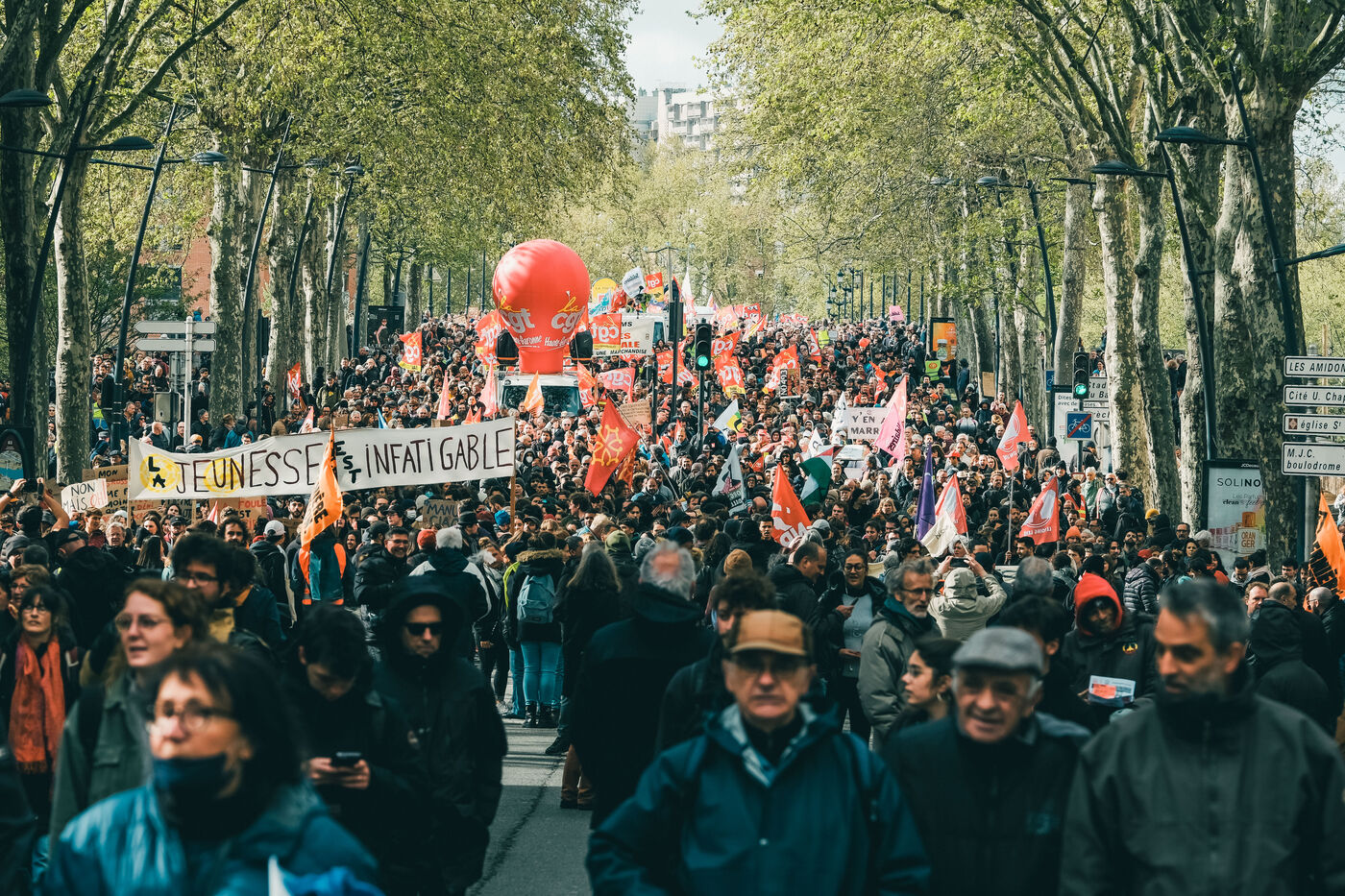 Toulouse, France, 2023-03-13. Douzième manifestation nationale en trois mois, suivant l'appel de l'intersyndicale, contre la réforme des retraites et le passage sans vote avec recours à l'article 49.3. Le Conseil Constitutionnel est appelé à se prononcer sur la légalité de la méthode d'adoption et de la légitimité de différentes parties de la loi.