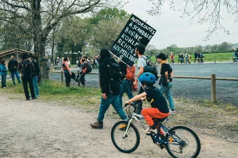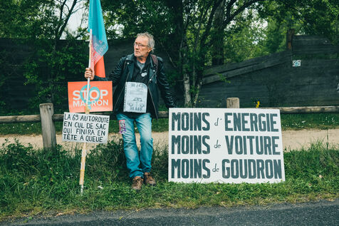 Saix, France, 2023-04-22. A l'appel de différents collectifs, une manifestation contre le chantier de l'autoroute A69 Toulouse-Castres a rassemblé plusieurs milliers de personnes. Soutenu par l'Etat et la Région Occitanie, le projet initié il y a plus de trente ans est l'objet d'une opposition locale massive. Selon eux, l'autoroute serait un chantier anachronique, remplaçant 400 ha de terres agricoles en bitume et béton, et pour un trafic routier insuffisant, un temps gagné faible et un tarif exorbitant. Les opposants proposent une alternative avec l'aménagement de la route nationale N126 déjà existante. La manifestation s'est déroulée dans le calme et sans débordements; un dispositif de 800 gendarmes avait été déployé.