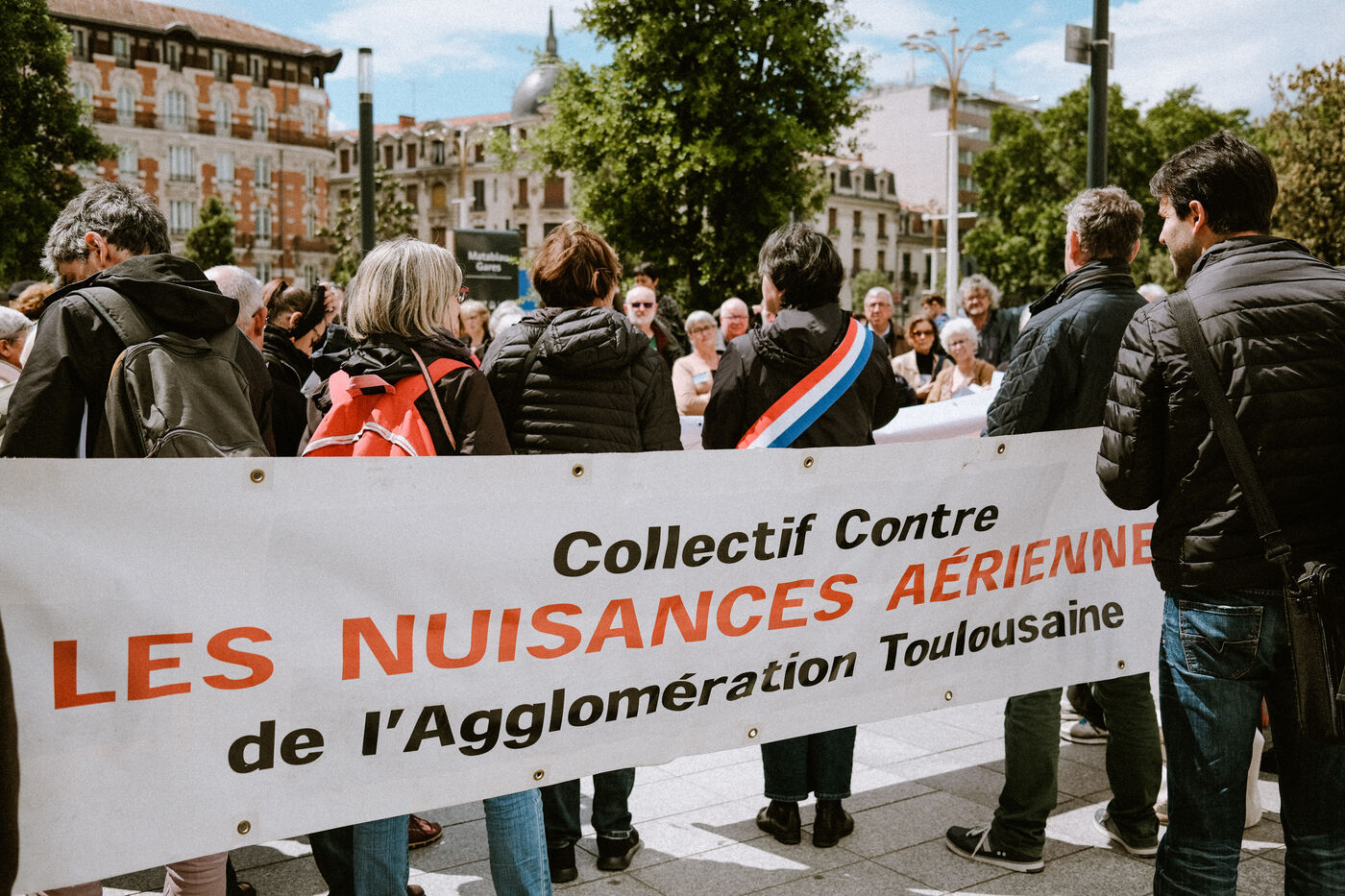 Toulouse, France, 2023-05-12. A week of mobilisation has taken place across Europe against aircraft nuisances and in favour of taking the train rather than the plane. In Toulouse, home to the historic Airbus headquarters, protesters are calling for a cap on air traffic at Blagnac airport, a reduction in noise and chemical pollution, and a night-time curfew.