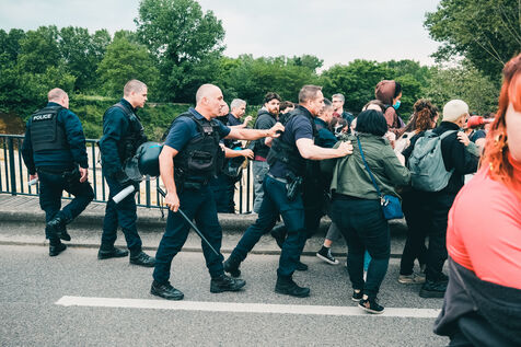 Toulouse, France, 2023-05-25. La venue du comédien-chanteur Gérard Depardieu a été accueillie par un rassemblement protestataire féministe. En tournée dans le pays autour des textes de la chanteuse Barbara, l'artiste est accusé par plusieurs personnes de violences sexuelles ou sexistes. Après une heure de blocage d'accès à la salle de spectacle, la police a évacué les manifestants avec des gaz lacrymogènes.