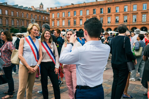 Toulouse, France, 2023-07-03. Après les heurts et émeutes liés à la mort du jeune Nahel, qui ont vu des mairies attaquées, jusqu'au domicile du maire de l?Haÿ-les-Roses parciellement incendié, le maire de Toulouse Jean-Luc Moudenc a appelé à un rassemblement d'élus et de citoyens, au moment où les sirènes sonnaient sur la place du Capitole. Quelques jours auparavent, l'édile avait été pris à partie lors de la fête de la musique, par des manifestants protestants contre la dissolution des Soulèvements de la terre.