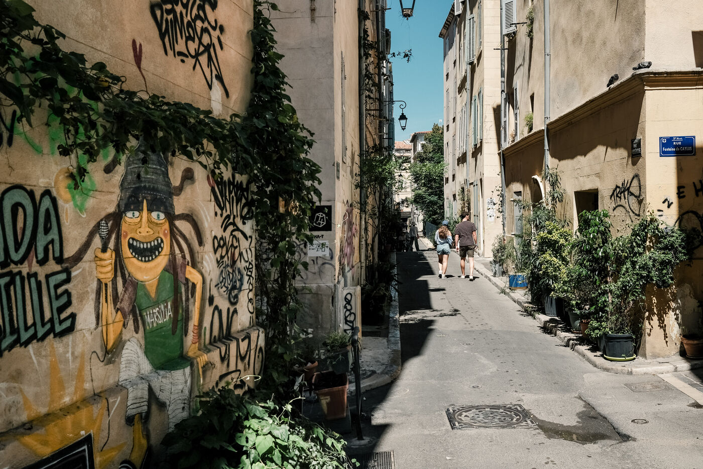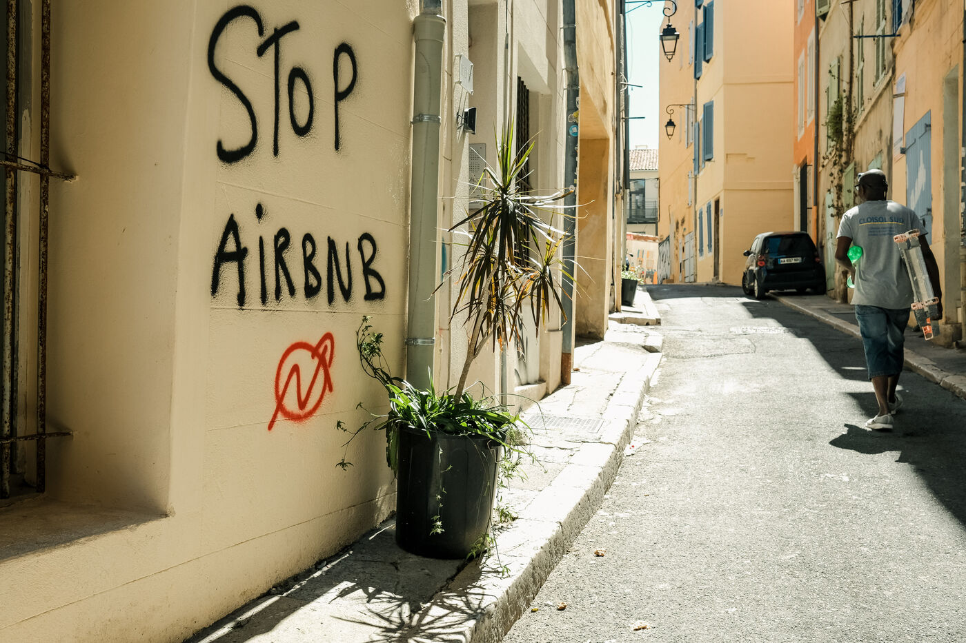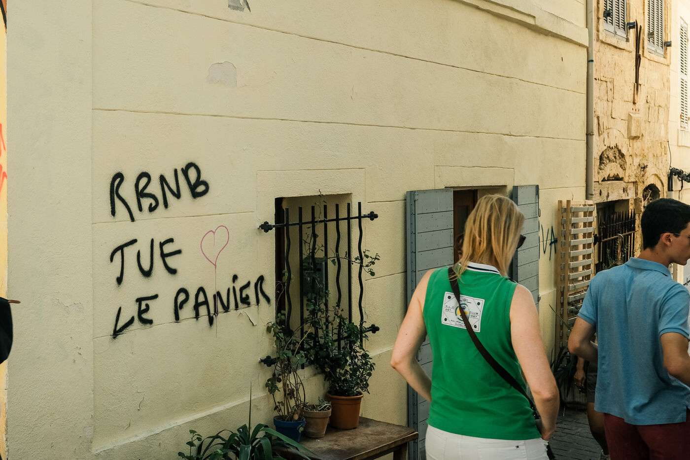 Marseille, Provence-Alpes-Côte d'Azur, France, 2023-08-08. In the working-class district of Panier, in the 2nd arrondissement of the Cité Phocéenne, tags hostile to the famous rental property platform are multiplying. Local residents accuse it, as in other major cities, of encouraging soaring rental prices and a shortage of properties to let.