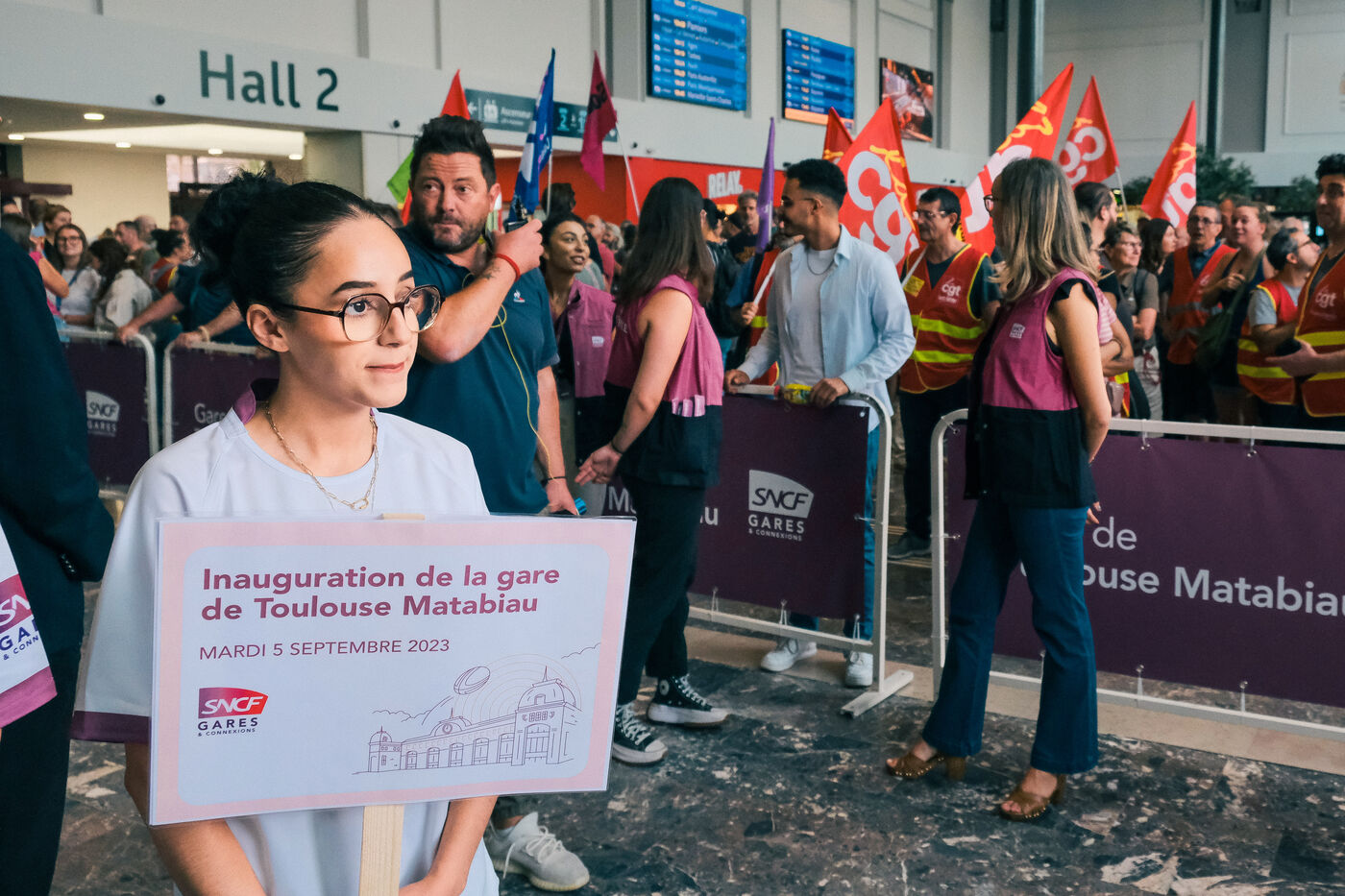 Toulouse, France, 2023-09-05. Après trois ans de travaux, la gare SNCF de Toulouse Matabiau a été inaugurée; mais les syndicats de cheminots réunis en intersyndicale ont perturbé la cérémonie, pour défendre le Service Public du ferroviaire (notamment contre le développement des boutiques commerciales dans la gare, l'abandon du frêt, ou la fin du monopole SNCF). Les forces de l'ordre ont été sollicitées pour empêcher les syndicalistes de pénétrer dans la gare. En aparté, la présidente de Région et le président de la SNCF ont signé la nouvelle Convention trains régionaux 2023-2032, et la feuille de route Ambition Commune.