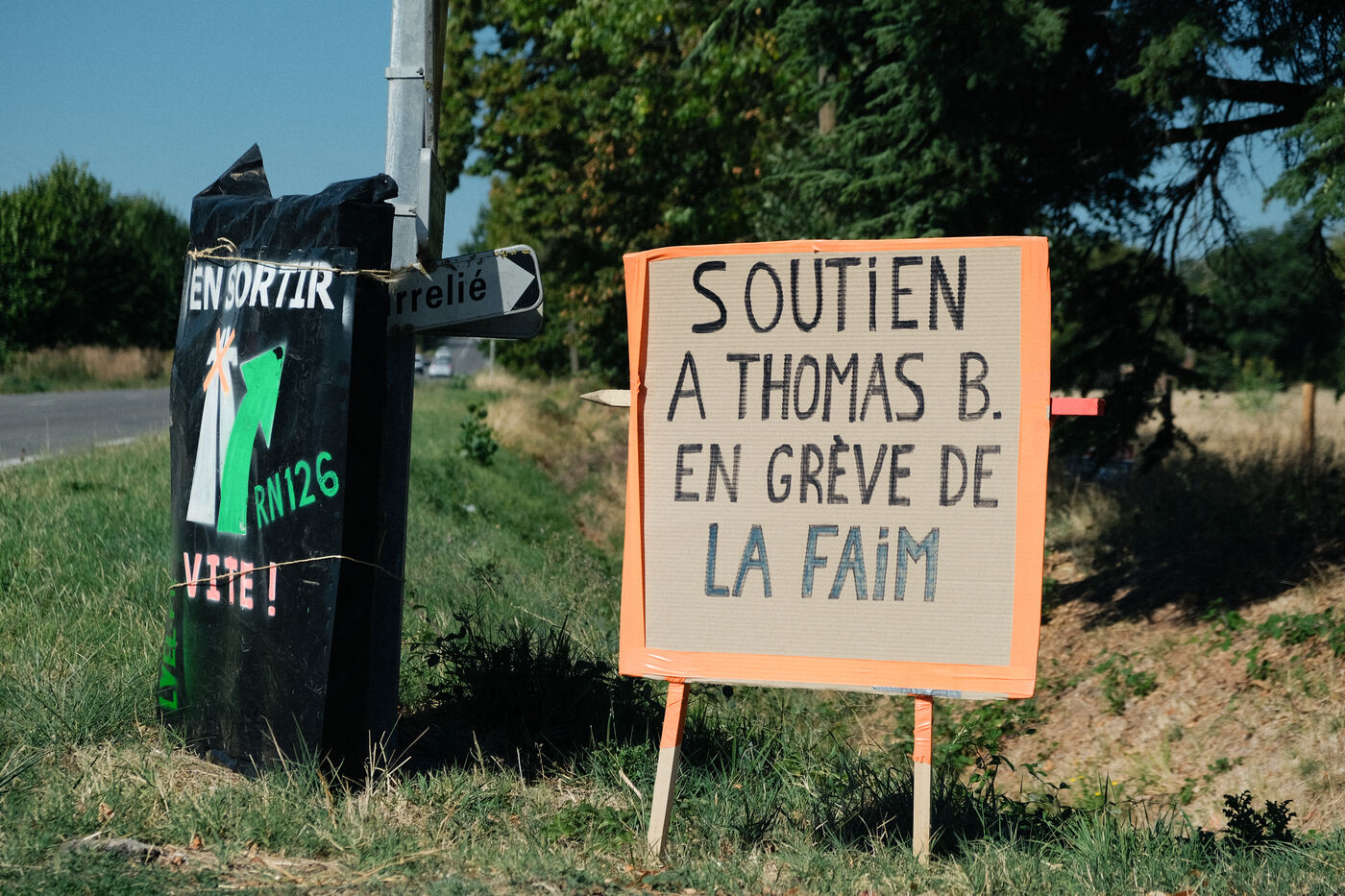 Saix, France, 2023-09-07. Thomas Brail of the National Tree Monitoring Group has been on hunger strike for 7 days now. To save the trees due to be felled along the route of the A69 Toulouse-Castres motorway, the activist and several others are occupying tents hung up at several sites. They are calling for a halt to the felling of the trees until the administrative court has given its ruling, but their demands do not seem to be being heeded.