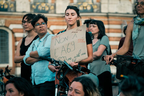 Toulouse, France, 2023-10-02. Rassemblement devant la mairie de Toulouse des opposants à l'autoroute A69. Autour des grévistes de la faim, un mur symbolique a été érigé, à la veille de la rencontre entre les opposants, la Présidente de la Région Occitanie et le cabinet du Ministre de la Transition Ecologique et Transports.