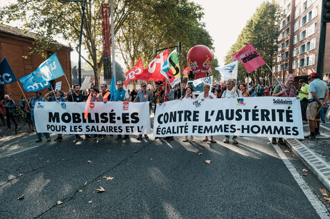 Toulouse, France, 2023-10-13. Five months after the promulgation of the pension reform, the workers' unions have called for a day of strikes and demonstrations. The main sectors represented were transport, education and youth, as well as self-employed doctors, whose surgeries were closed. At a time when inflation is still high, the defence of purchasing power is the main demand, alongside gender equality.