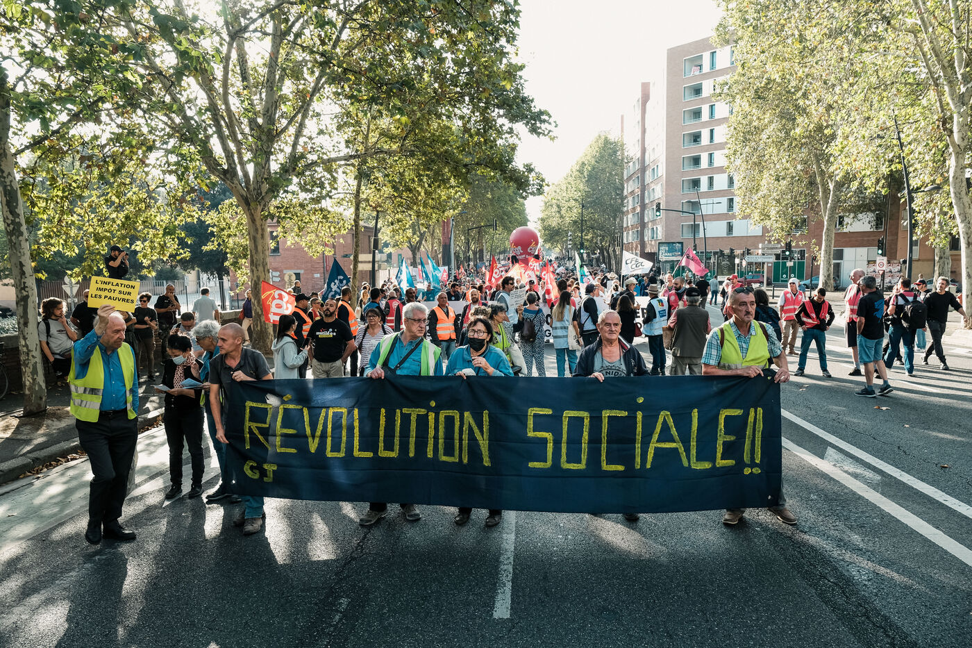 Toulouse, France, 2023-10-13. Cinq mois après la promulgation de la réforme des retraites, les syndicats de travailleurs ont appelé à une journée de grève et de manifestation. Principaux secteurs représentés : transports, éducation, jeunesse, mais aussi médecins libéraux dont les cabinets sont fermés. A l'heure où l'inflation est encore forte, la défense du pouvoir d'achat arrive en première revendication, à côté de l'égalité femmes-hommes.