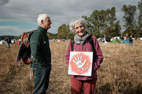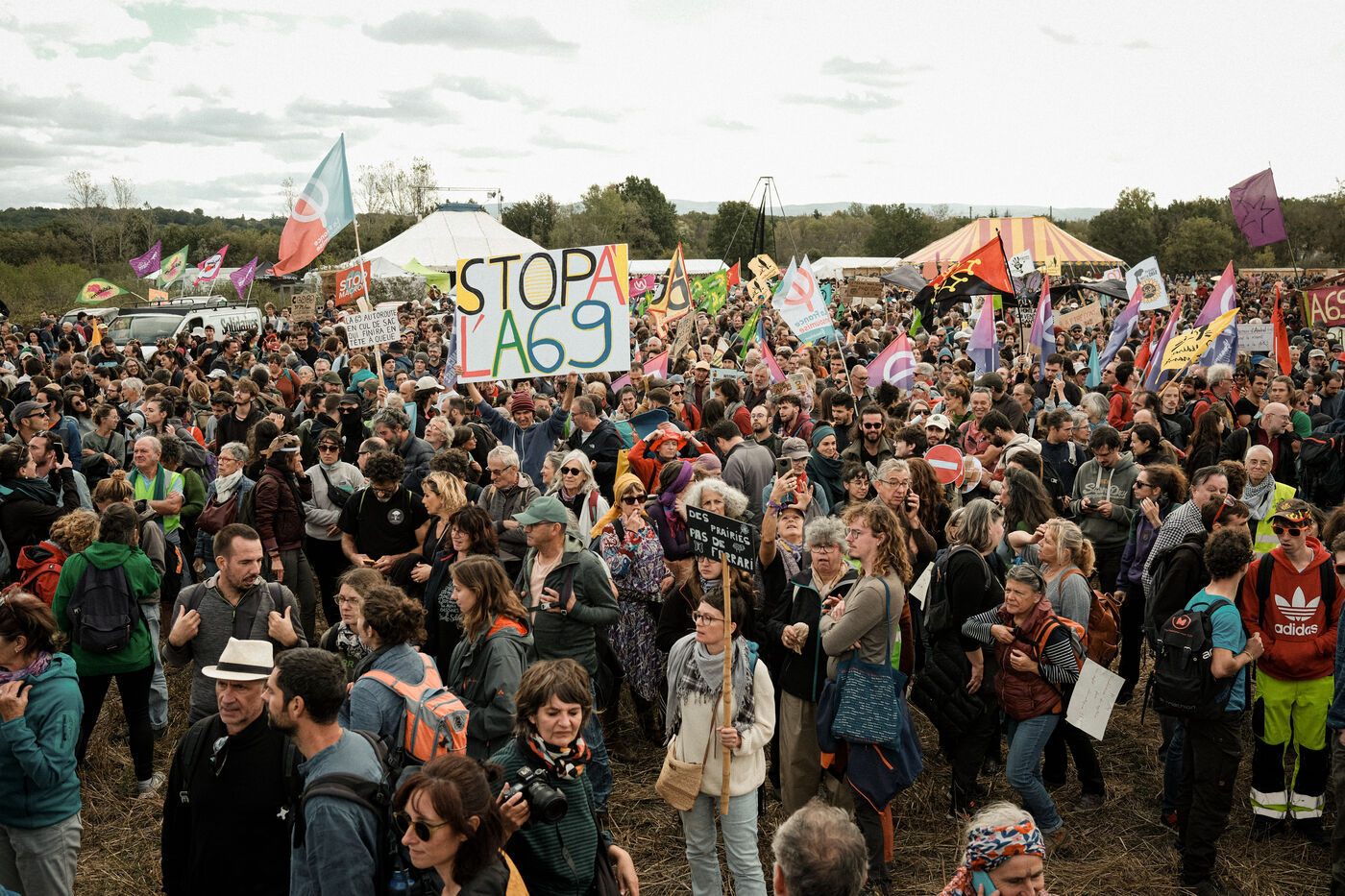 Saïx, France, 2023-10-21. Grande manifestation et week-end de mobilisation contre le chantier de l'autoroute A69 Toulouse-Castres. Après des mois d'opposition, juqu'à la grève de la faim de plusieurs personnes, le chantier avance malgré tout; pour s'y opposer, près de 10 000 personnes, selon les organisateurs, ont manifesté sous des slogans "Nous sommes tous des éco-terroristes" ou "No Macadam".
