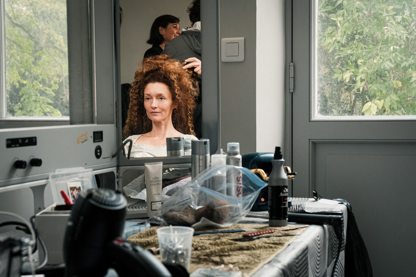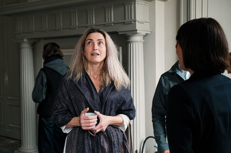 Toulouse, France, 2023-10-23. Le tournage du téléfilm co-réalisé par Julie Gayet et Mathieu Buisson s'est installé pour une journée dans le château de la Reynerie, à Toulouse. Biopic retraçant la vie de la femme révolutionnaire et féministe Olympe de Gouges, le téléfilm devrait sortir à l'automne 2024. Ambiances de plateau et accueil de jeunes du quartier populaire du Mirail par Julie Gayet.