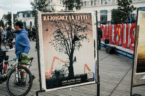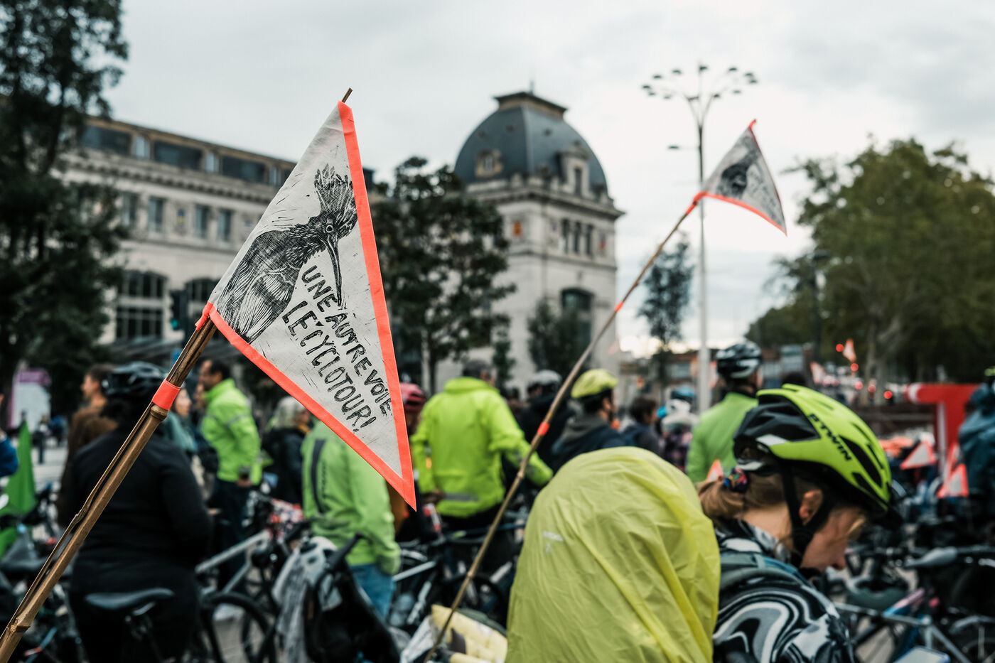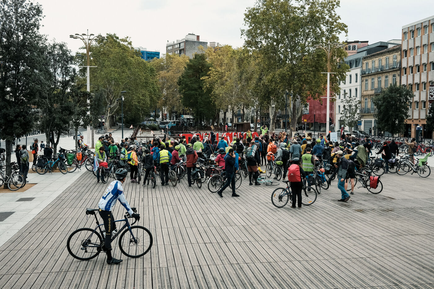 Toulouse, France, 2023-11-01. Mobilisé contre le chantier de l'A69, le collectif La Voie Est Libre a lancé le départ du Cyclotour avec une centaine de personnes sur le parvis de la gare Matabiau. Cette tournée pour une alternative à l'autoroute suivant son tracé rejoindra à vélo Castres en 4 journées, ponctuées par des soirées concert et spectacles.