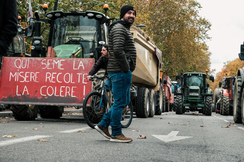 Toulouse, France, 2023-11-22. Around a hundred tractors belonging to the Jeunes Agriculteurs (Young Farmers) and the FDSEA (Farmers' Federation) gathered from all over the south-west to demonstrate against taxes on agricultural fuel, delays in European payments under the Common Agricultural Policy (CAP), as well as ever-increasing standards and the price of plant-health input molecules. The meeting with the Direction Régionale des Affaires Agricoles et Forestières (DRAAF) was unsuccessful.