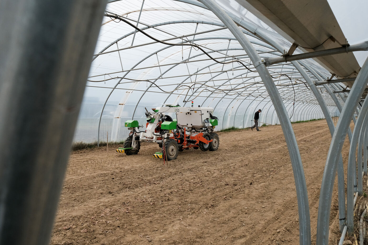Escalquens, France, 2023-11-29. The OZ electric robot, launched in 2013, assists market gardeners with tasks such as weeding and transporting agricultural loads. Its creator, Naïo Technologies, was a prizewinner at the Great Exhibition of Made in France, and in the France 2030 investment plan.