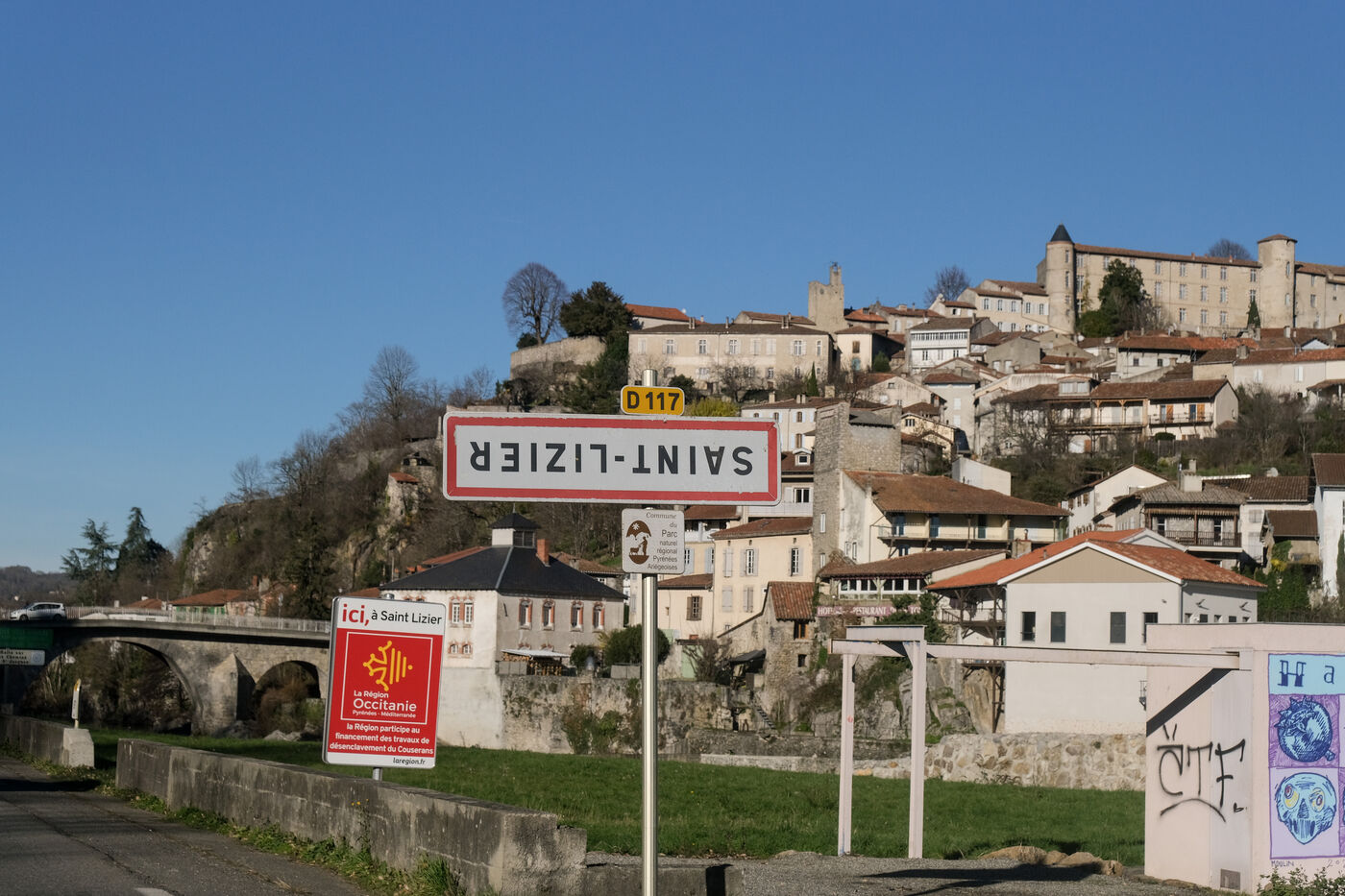 Pyrenees, France, 2023-12-27. Many signs at the entrances and exits of towns and villages are hanging upside down: for several weeks now, farmers belonging to the FDSEA and JA (Jeunes Agriculteurs) unions have been conducting an operation called "On marche sur la tête" ("We're walking on our heads"), to denounce the taxes on agricultural fuel, the delays in European payments under the Common Agricultural Policy (CAP), but also the ever-increasing standards and the price of phytosanitary input molecules.