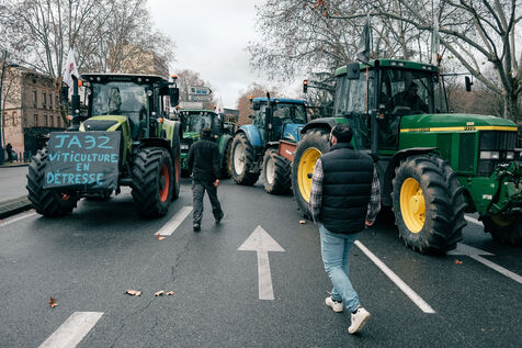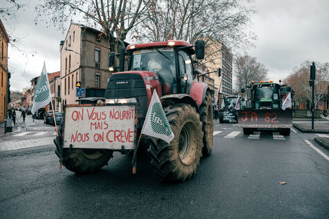Toulouse, France, 2024-01-16. Converging from the surrounding départements, nearly 400 tractors and 1,000 farmers demonstrated in the streets of the regional capital, in response to a call from the FNSEA and Jeunes Agriculteurs unions. They were protesting against ever-increasing taxes and standards, and ever-decreasing remuneration.