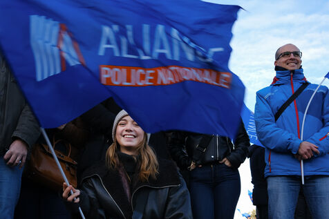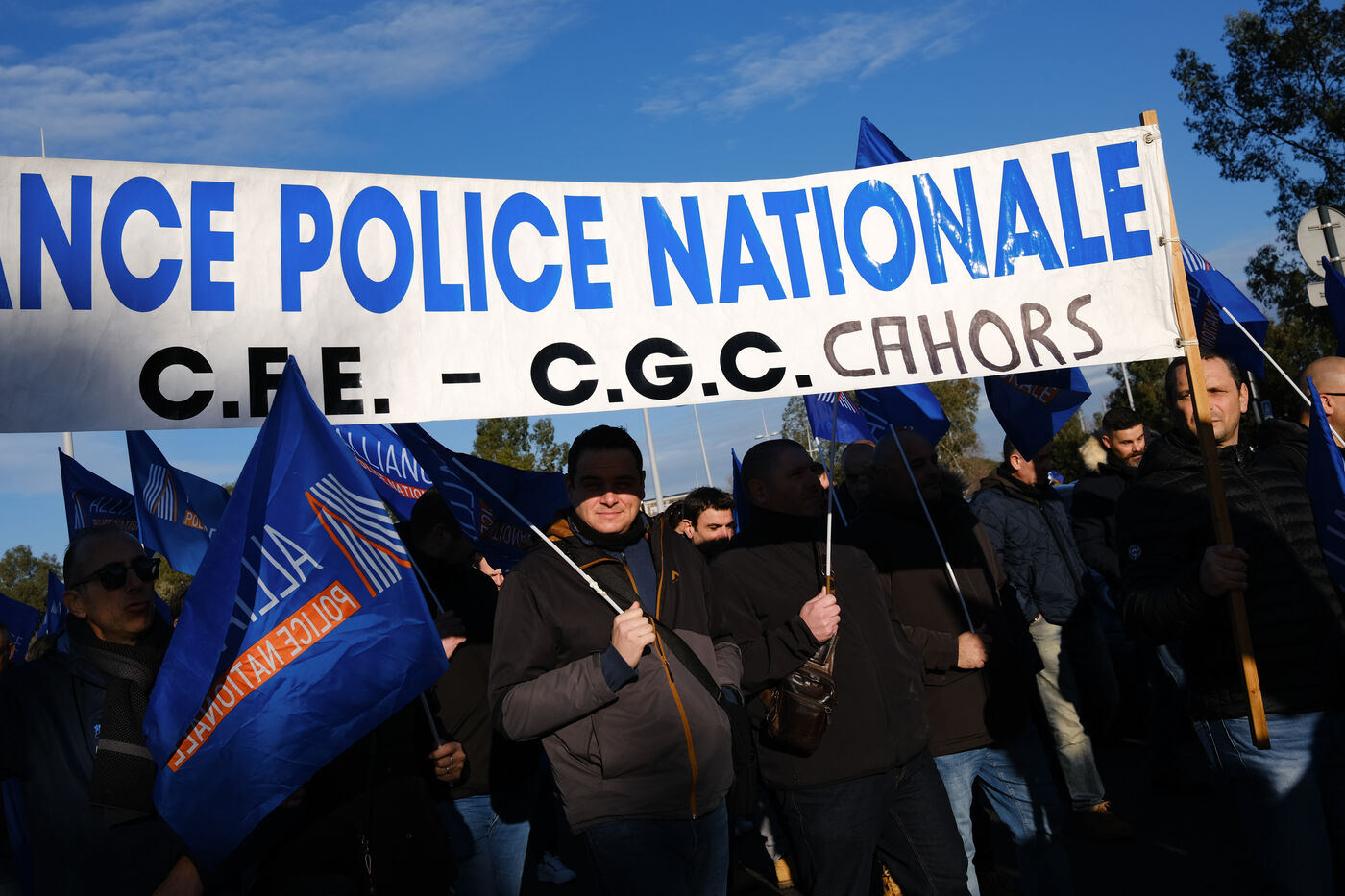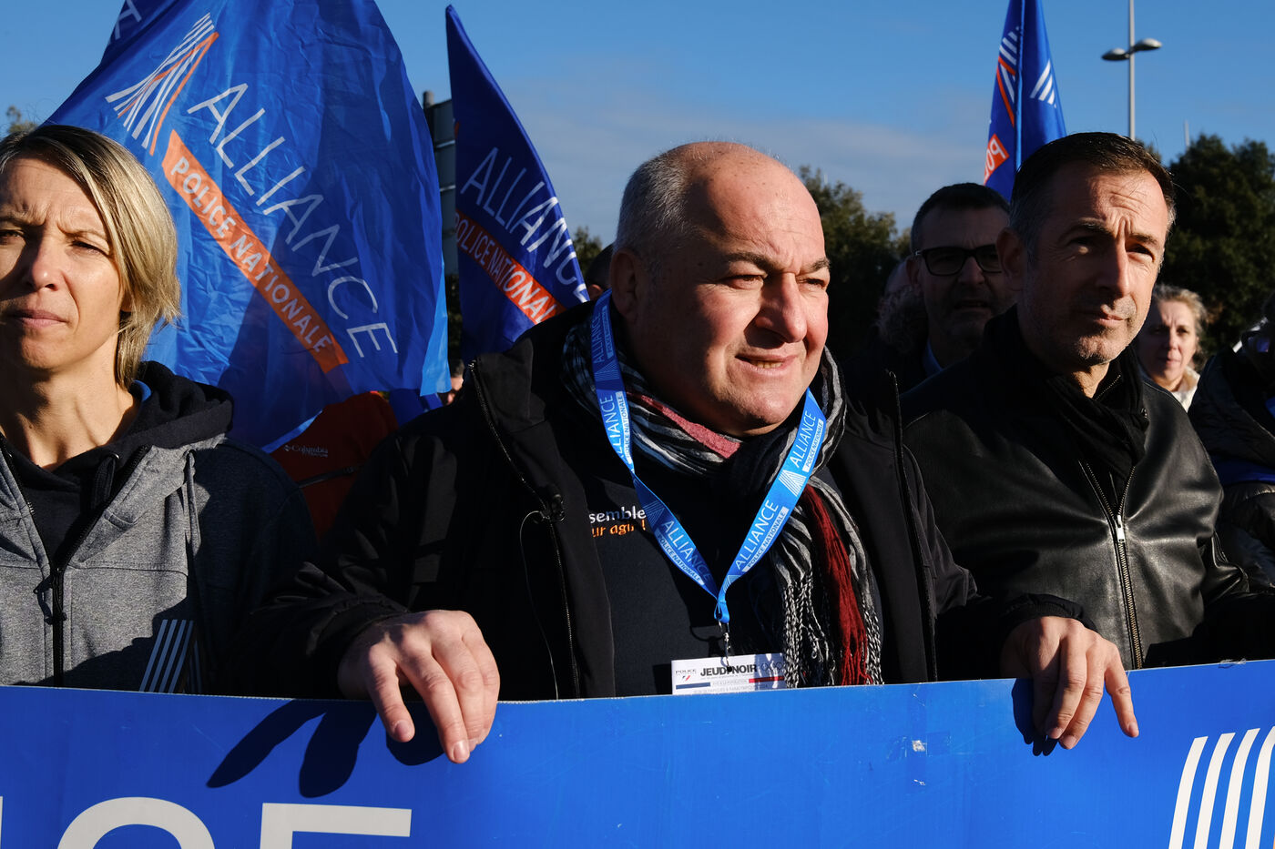 Blagnac, France, 2024-01-18. In the face of the deteriorating working conditions that are being forecast for the Paris 2024 Olympic Games, the Alliance union (Police Nationale) is organising a "Black Thursday" and a "strike of zeal", with a rally in front of Toulouse-Blagnac airport.