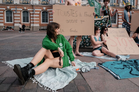 Toulouse, France, 2024-02-24. A group of Young Ecologists carried out a symbolic action in the Place du Capitole: putting on a swimming costume in the middle of winter to denounce the inaction of the institutions (town hall, metropolis and State) in the face of climate change.