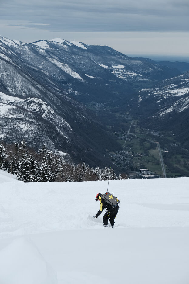 Superbagnières, France, 2024-03-04. La préfecture de la Haute-Garonne et la compagnie républicaine de sécurité (CRS) Pyrénées ont organisé un exercice de secours en montagne, qui a fait intervenir conjointement les forces de Police et de Gendarmerie. Simulant une avalanche avec des skieurs et surfeurs portés disparus, l'opération, qui a lieu chaque année, a permis de projeter des personnels de secours, pisteurs, maître-chien, ou encore hélicoptère, et de retrouver quatre personnes (deux humains et deux mannequins).