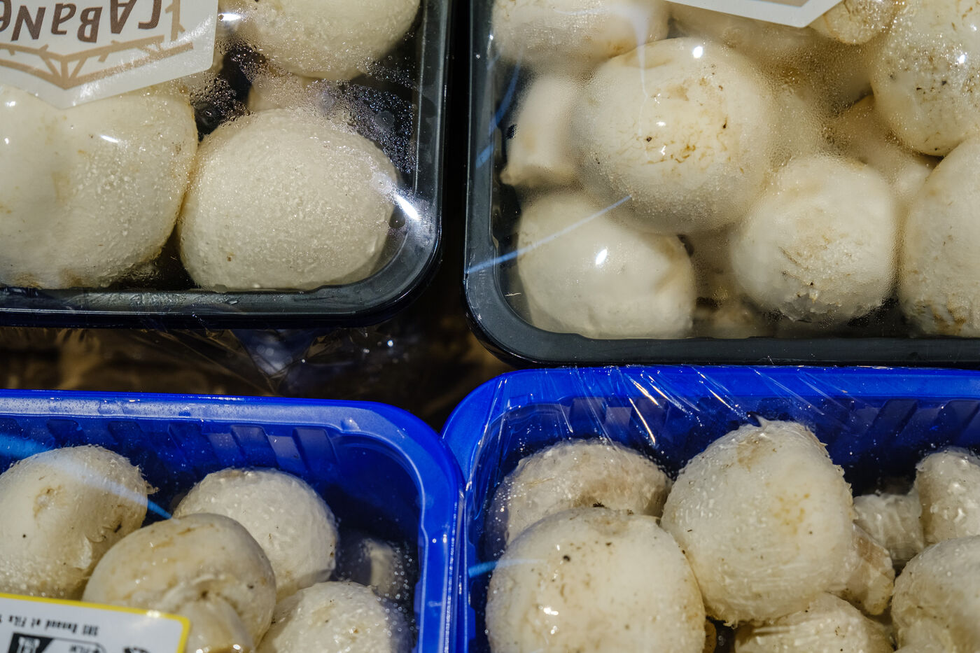 Gros plan de fruits et légumes emballés dans du plastique dans les rayons d'un hypermarché de la banlieue de Toulouse, Sud de la France, le 20 mars 2024.