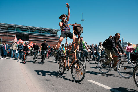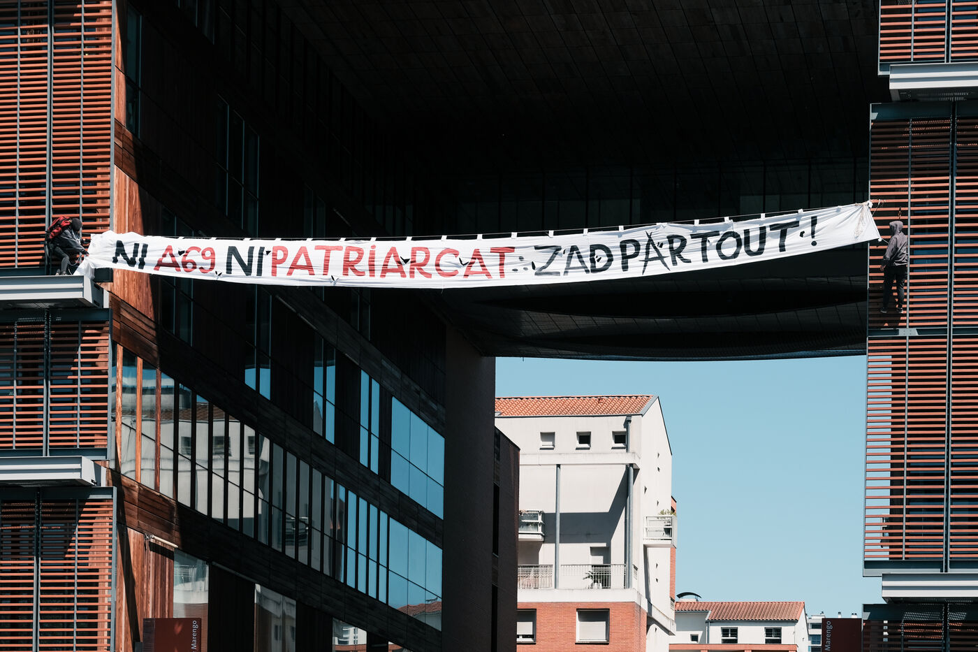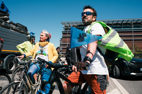 Massive demonstration of opponents of the construction of the A69 motorway in Toulouse, southwest of France, on April 21, 2024. Leaving Castres a week earlier, a caravan of cyclists ended in the pink city on their journey to show alternative mobility to the A69.