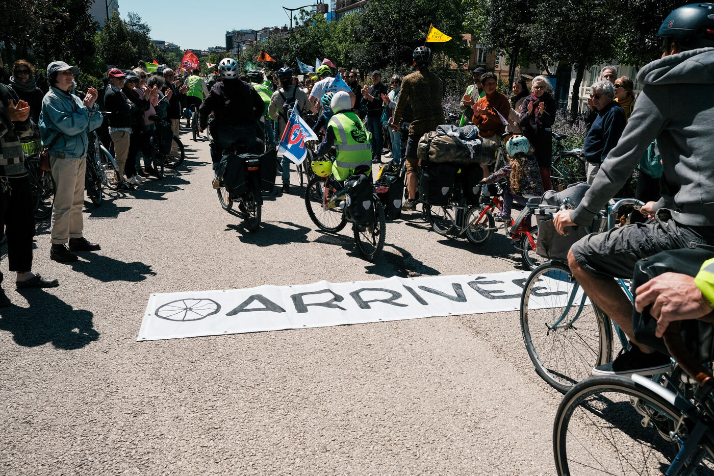 Manifestation massive des opposants à la construction de l'autoroute A69 à Toulouse, sud-ouest de la France, le 21 avril 2024. Partie de Castres une semaine auparavant, une caravane de cyclistes terminait dans la ville rose sont périple pour montrer des mobilités alternatives à l'A69.