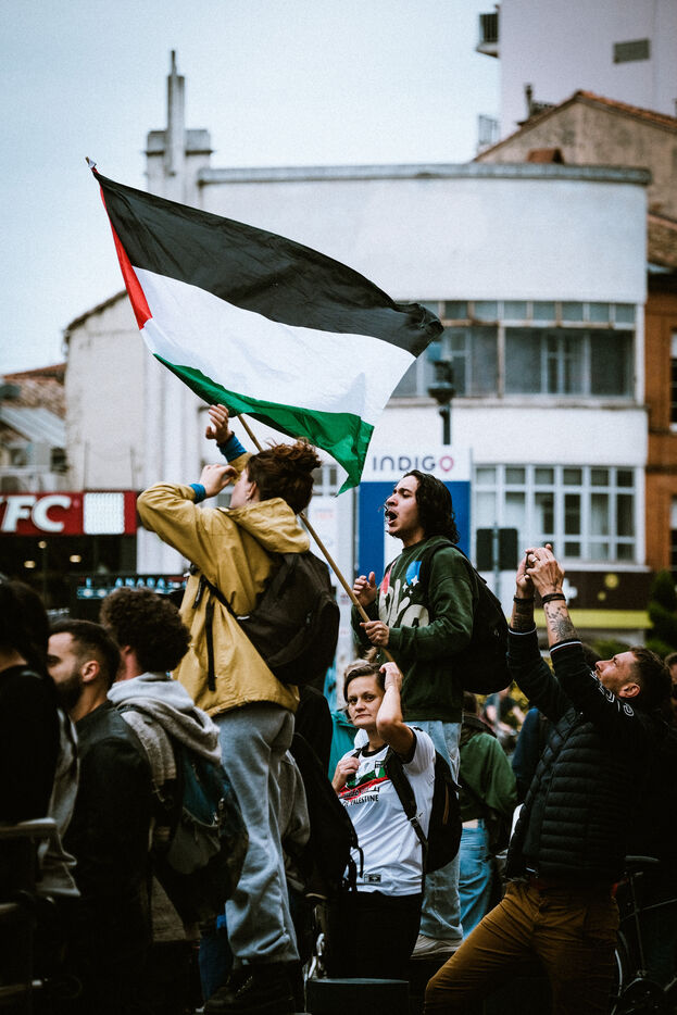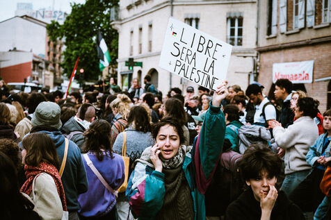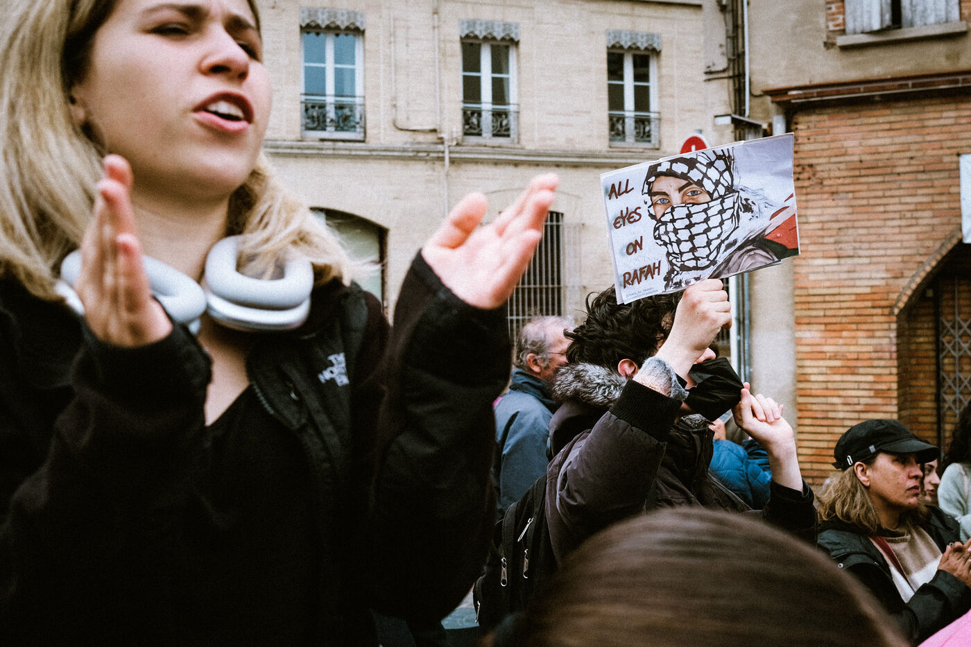 Des manifestants se rassemblent en soutien à la population palestinienne de Gazah après les tirs israëliens meurtriers sur un camp de déplacés de Rafah, à Toulouse, sud-ouest de la France, le 27 mai 2024.