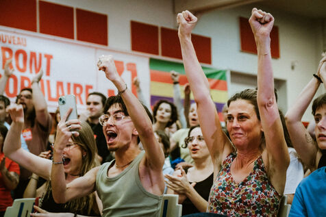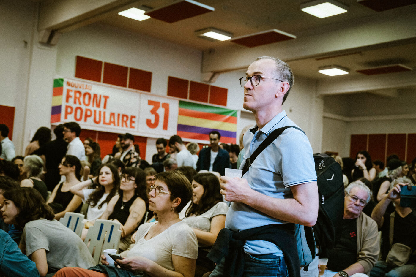 Soirée des résultats du second tour des élections législatives 2024 suite à la dissolution de l'assemblée nationale à la Bourse du Travail de la CGT à Toulouse, le 7 juillet 2024.