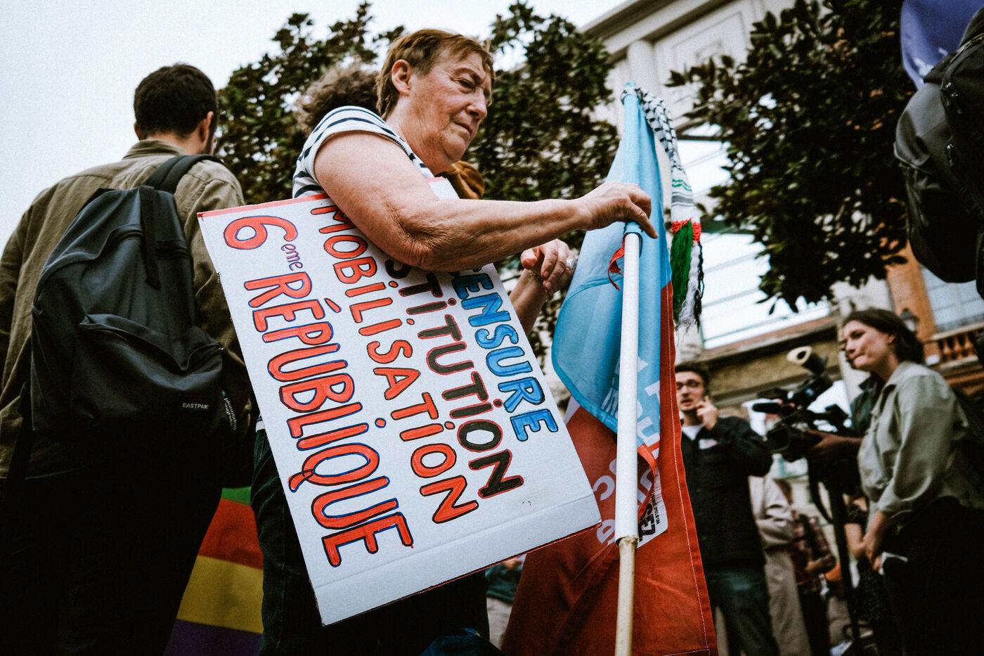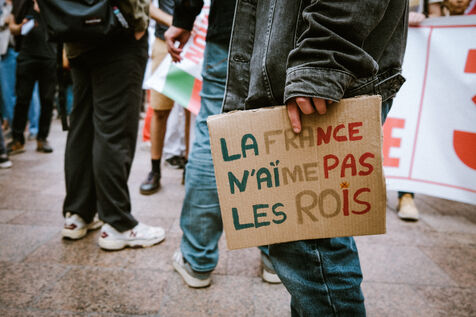 Marche contre le nouveau gouvernement Barnier, pour le respect du résultat du vote aux dernières élections législatives et la destitution du Président de la République à l'appel d'organisations de jeunesse et du parti de gauche La France Insoumise (LFI) à Toulouse, sud-ouest de la France, le 21 septembre 2024.
