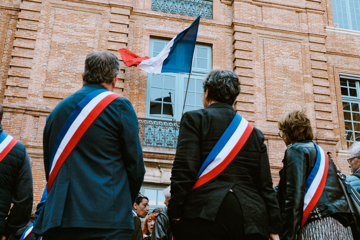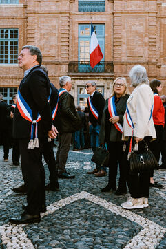 Demonstration of a hundred mayors in front of the prefecture against government budget cuts and loss of revenue for local authorities in Toulouse, southwest France on November 7, 2024.