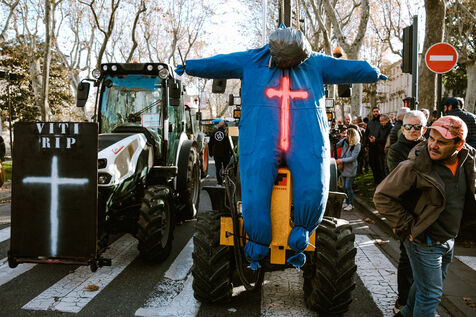 Demonstration organized by farmers and winegrowers from the FDSEA and Jeunes Agriculteurs unions concerned about the EU-Mercosur treaty and the weak progress on government promises from the beginning of the year in Carcassonne, southwest France on November 30, 2024.