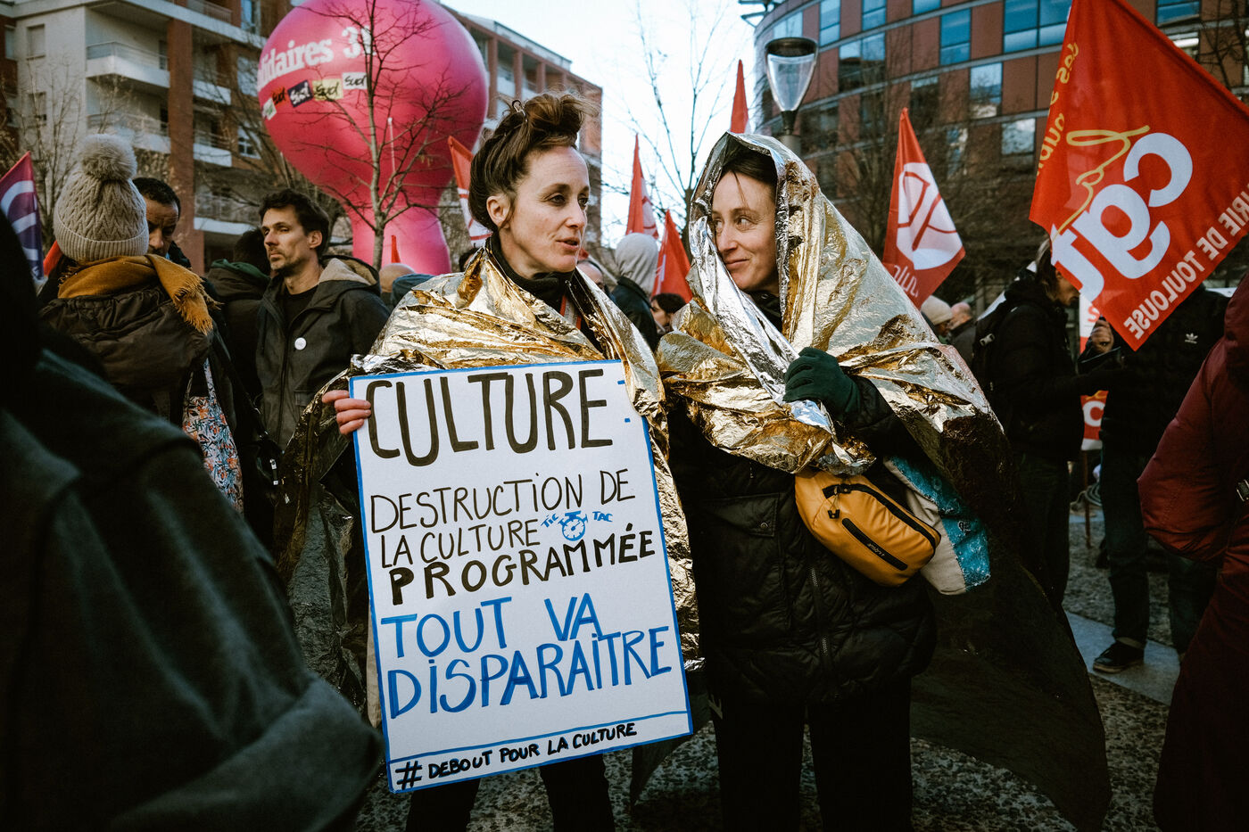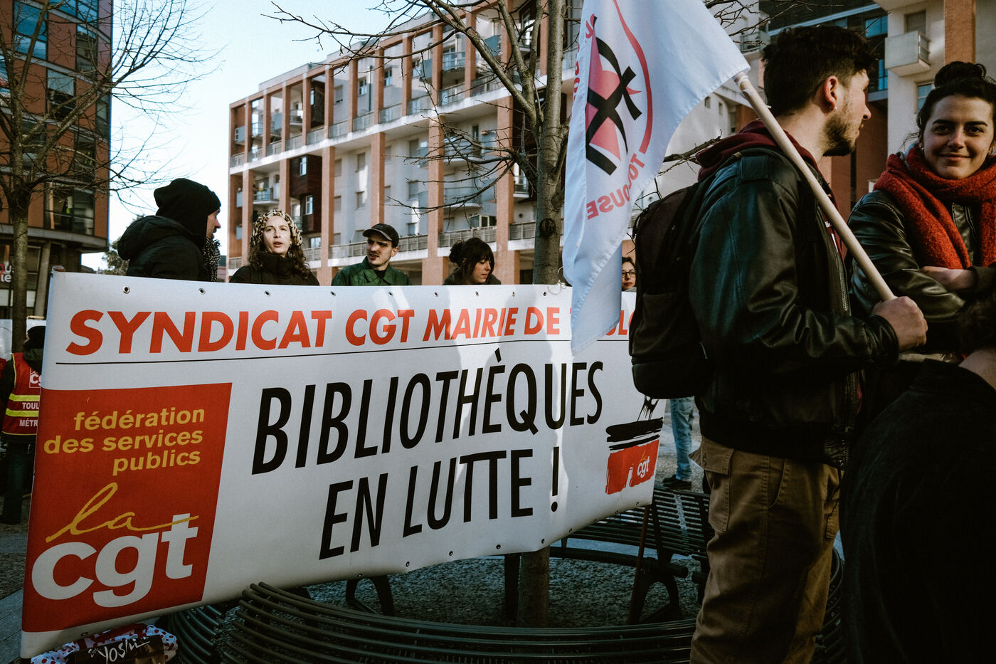 Gathering of municipal library workers on strike since December 5 against the jobs and budgets cuts linked to the public accounts recovery policy by the town hall in Toulouse, southwest France on February 4, 2025.