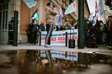 Manifestation pour la libération de Georges Abdallah devant Sciences Po et contre les partenariat universitaires avec Israël à Toulouse, sud-ouest de la France le 13 février 2025.