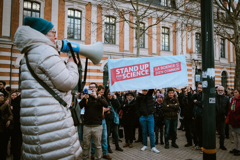 Rally of french scientists from the Stand Up For Science movement in solidarity with scientists in the United States who face the dismantling measures of the Donald Trump government in Toulouse, southwest France on March 7, 2025.