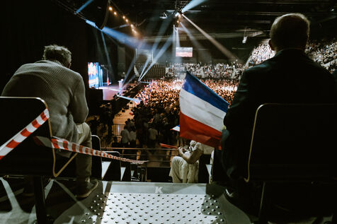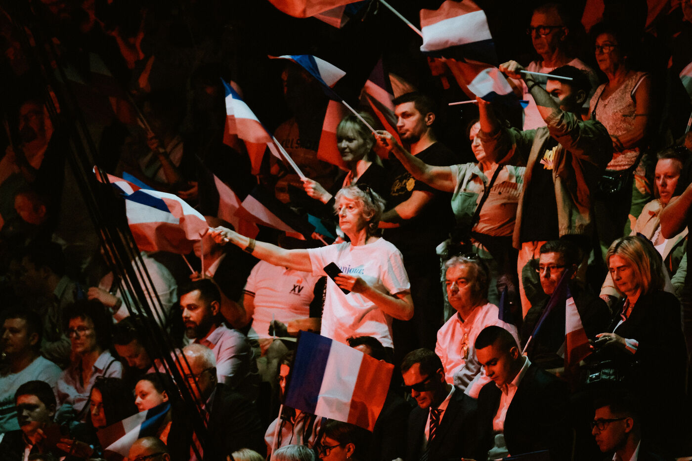 Meeting du parti d'extrême droite Rassemblement National pour le traditionnel 1er Mai un mois après la condamnation d'inéligibilité de sa leader Marine Le Pen et un an avant les prochaines élections municipales à Narbonne, sud de la France le 1er mai 2025.