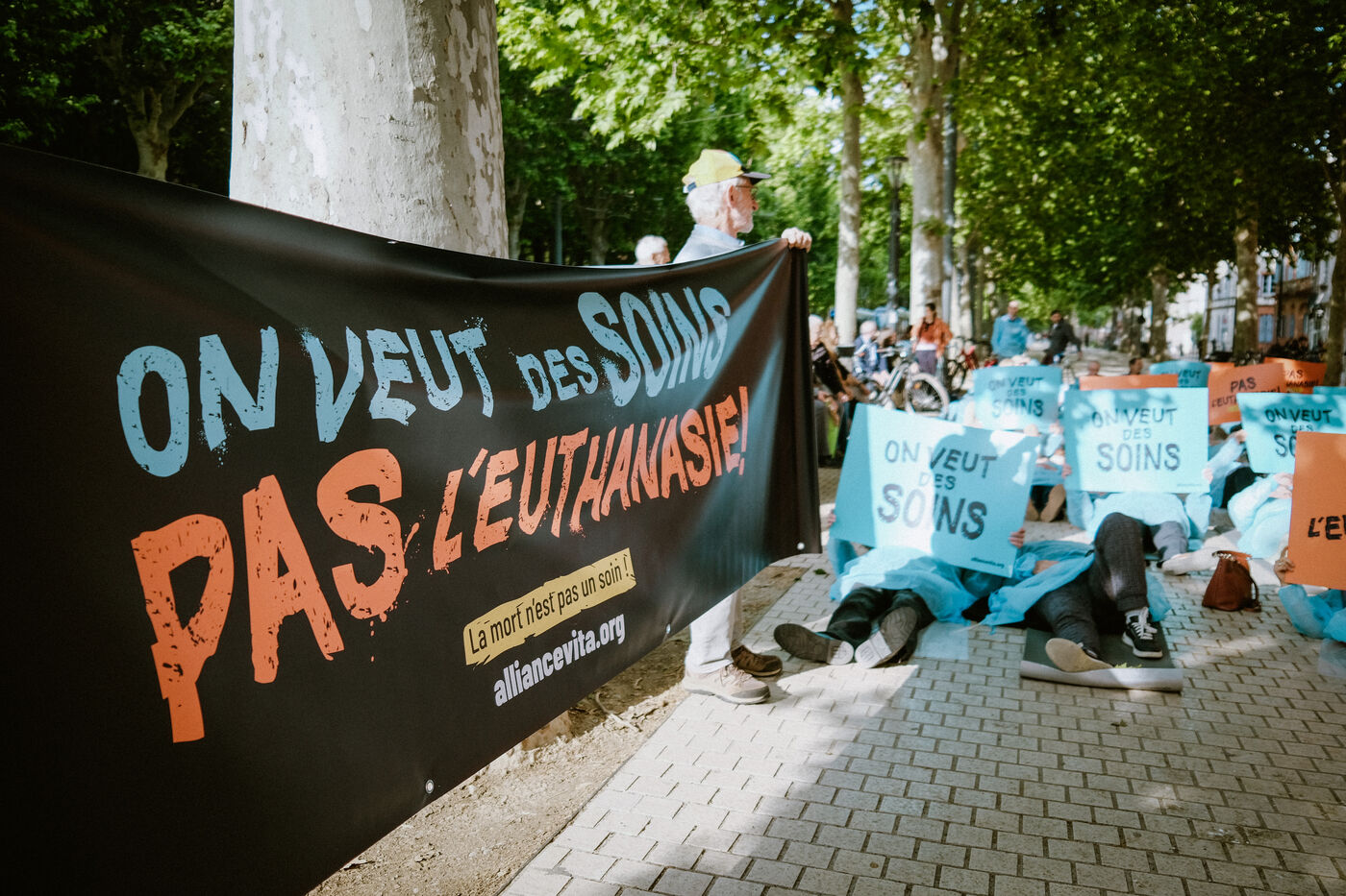 Rally of members of the pro-life association Alliance Vita against the end-of-life bill legalizing assisted dying (otherwise known as euthanasia or assisted suicide) and to demand more care in Toulouse, southwest France on May 12, 2025.