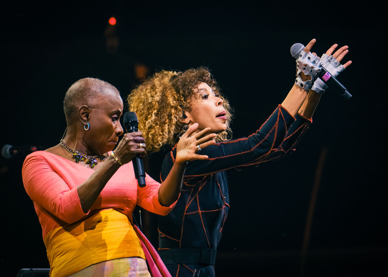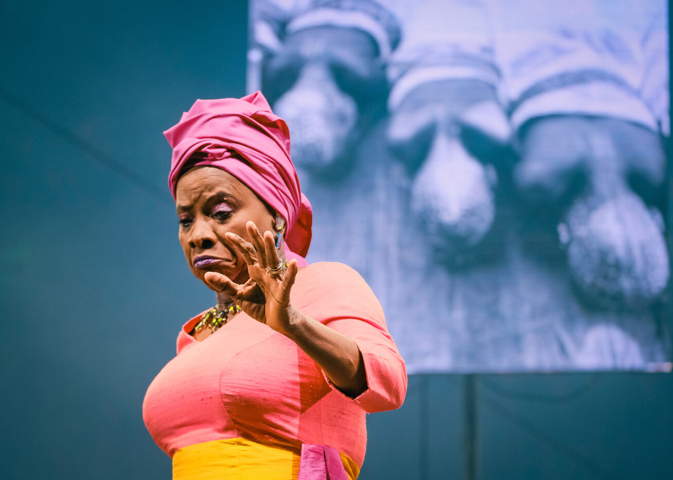 La diva béninoise accompagnée des brésiliennes Flavia Coelho, Karla Da Silva et Puma Camillê au festival Rio Loco célèbre depuis 30 ans les musiques du monde en bords de Garonne à Toulouse, sud-ouest de la France le 15 juin 2025.