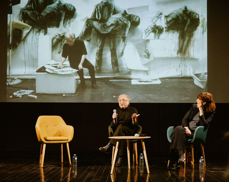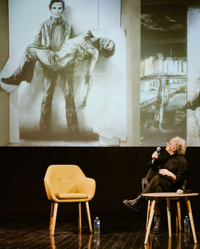 L'artiste plasticien de rue Ernest Pignon-Ernest lors d'une conférence autour de son œuvre à Toulouse, sud-ouest de la France le 10 avril 2025.