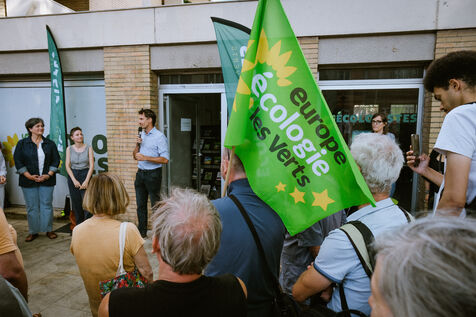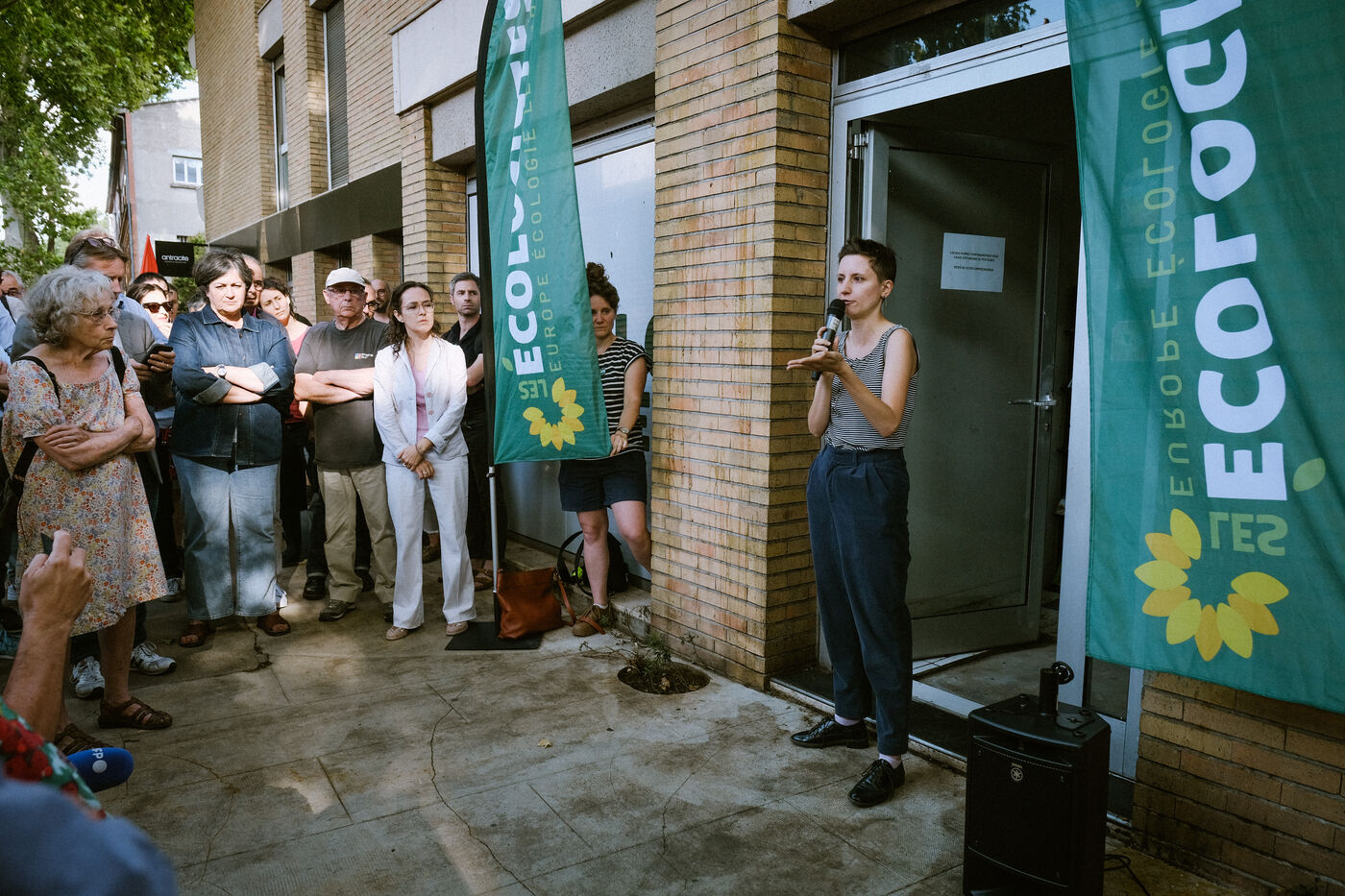 Rassemblement de soutien deux jours après la dégradation de la permanence du parti écologiste Europe Ecologie Les Verts (EELV) dans la nuit par des agriculteurs de la Coordination Rurale mécontents de l'opposition à la loi Duplomb à Toulouse, sud-ouest de la France le 24 juillet 2025.