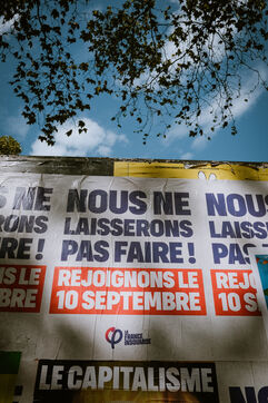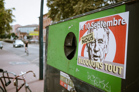 General assembly and posters stuck in the street on the eve of the vote of confidence in the Bayrou government and a few days before the strikes and demonstrations planned for September 10 under the slogan "Block Everything" in Toulouse, southwest of France on September 7, 2025.
